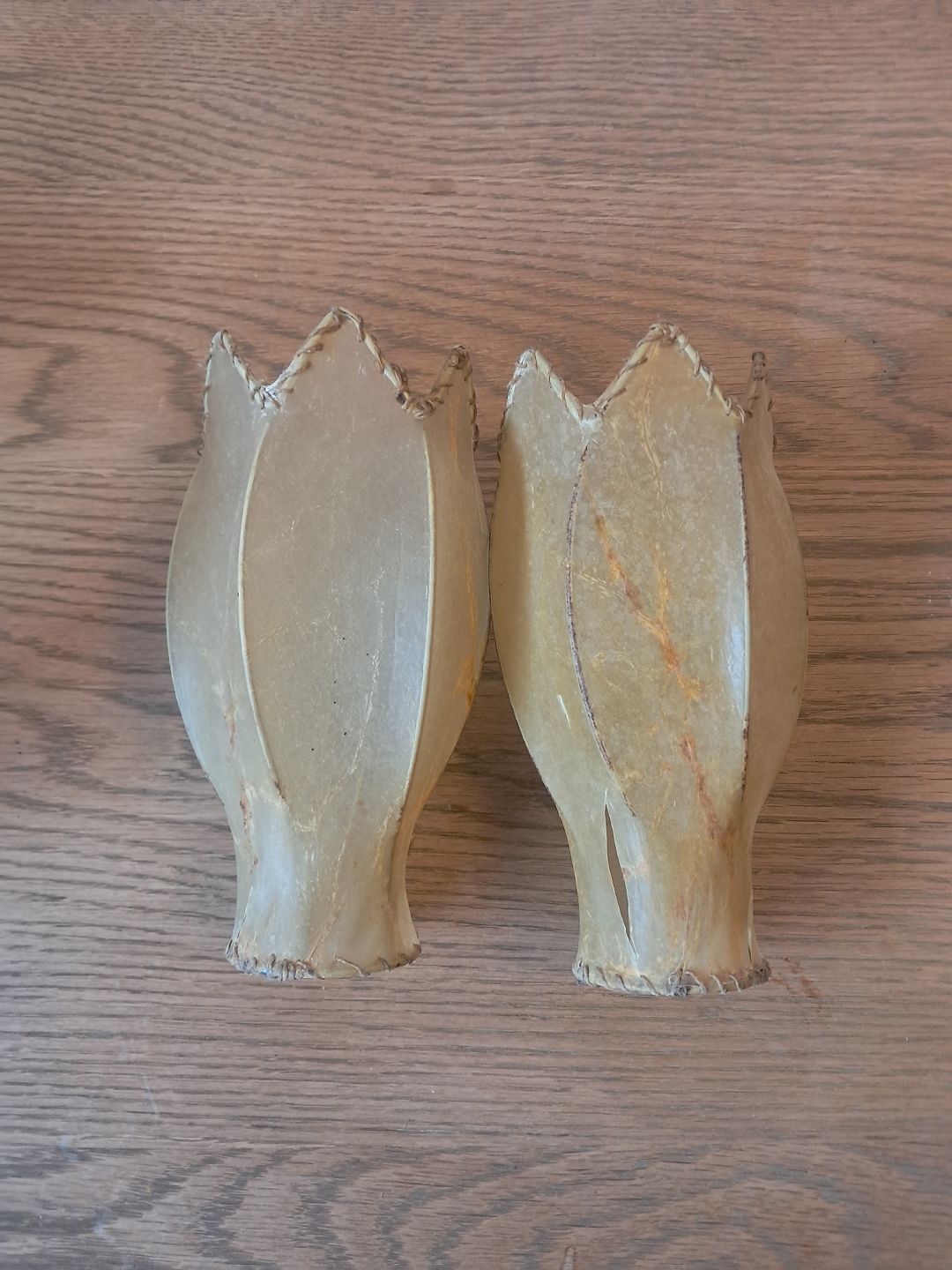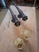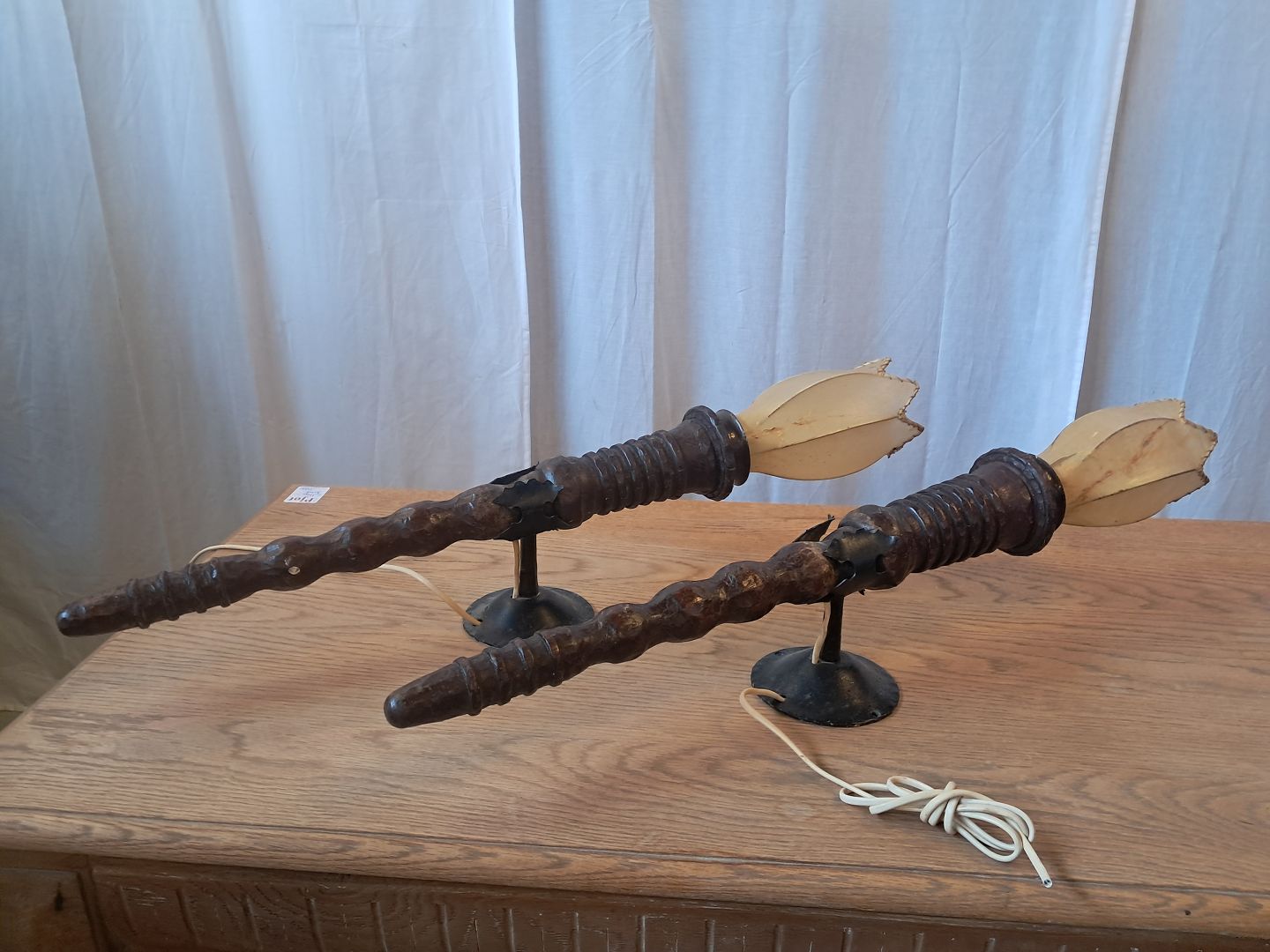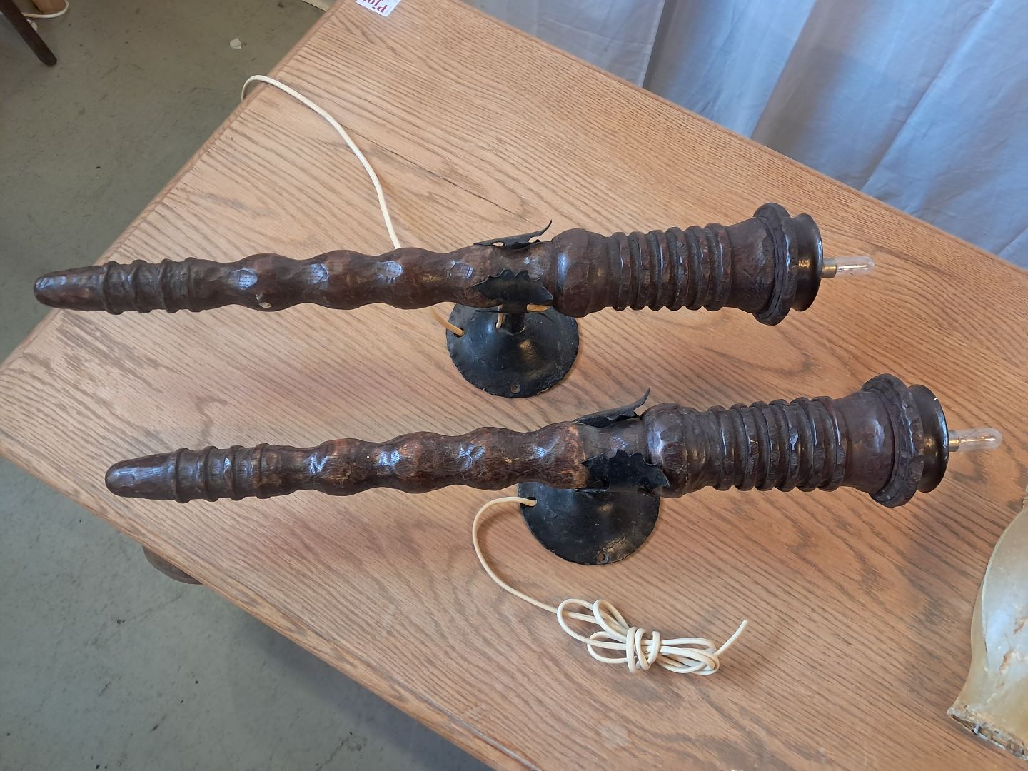 2 Væglamper i massivt egetræ og smedejern, fra 1930erne. De har brugsspor og skærmene her små defekter. Højde 78cm Emne nummer: 77871
