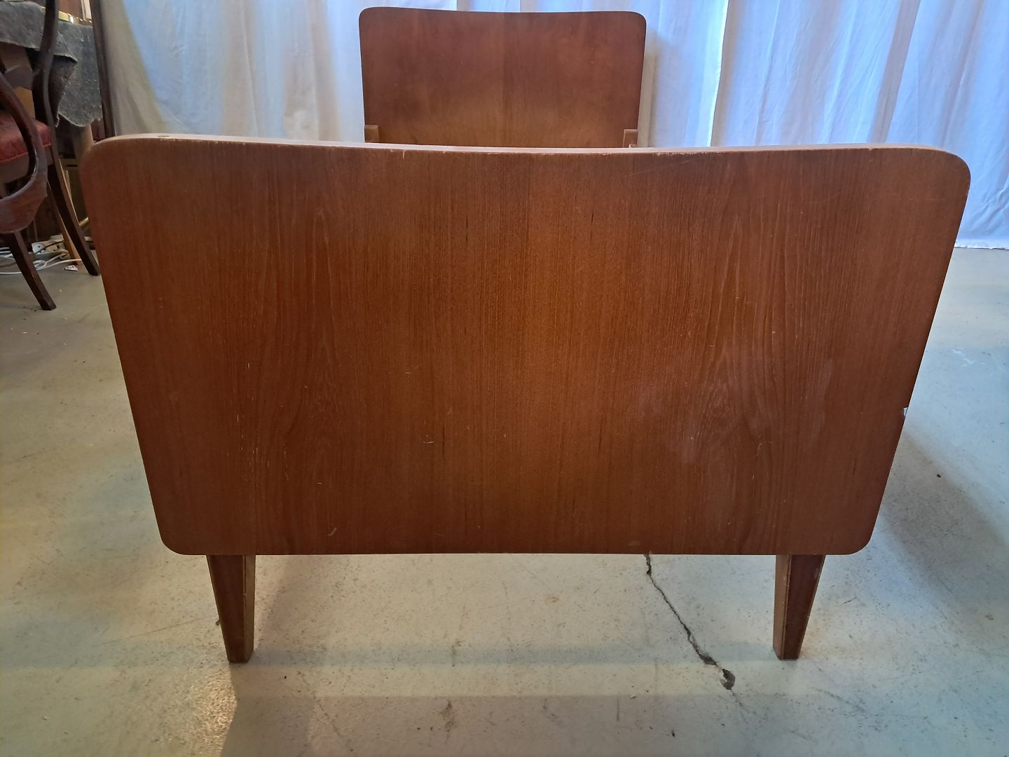 Seng i fineret teaktræ, fra 1960erne. Den har brugsspor og der medfølger ikke madras. Gavlhøjde 76cm Madras mål : 85cm X 190cm Emne nummer: 77873