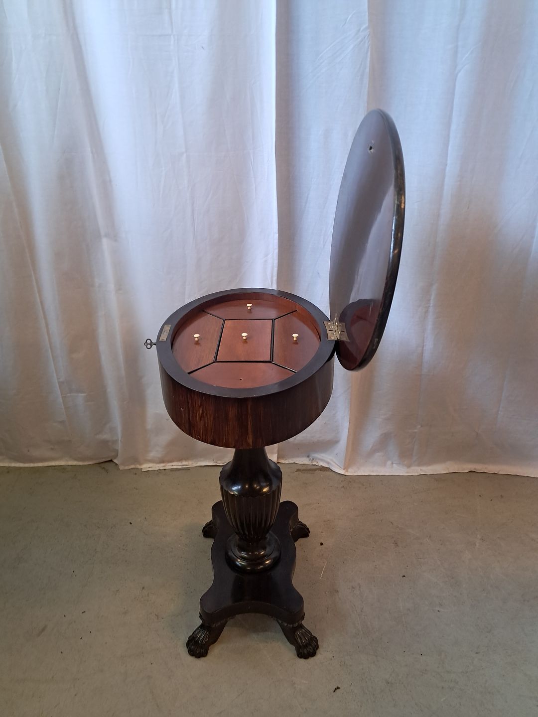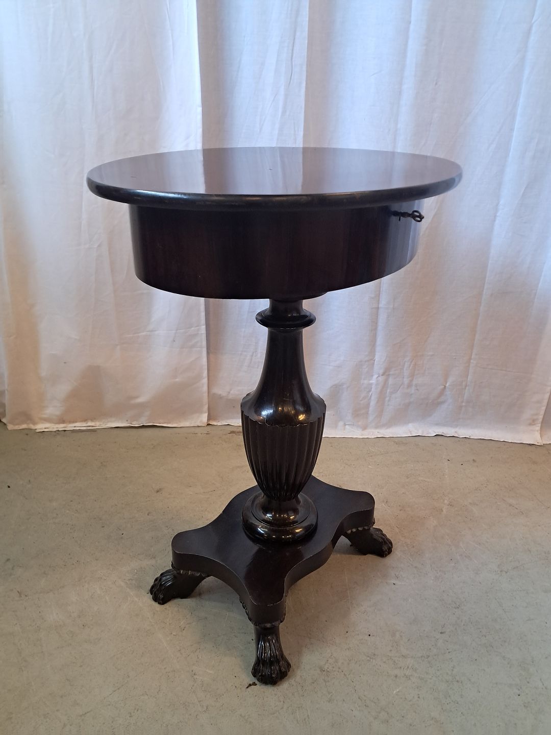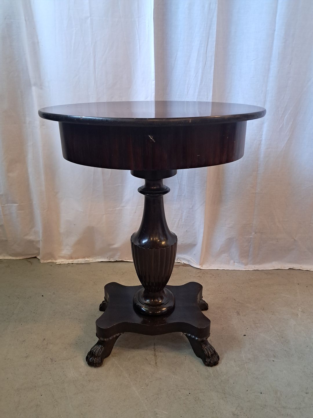 Søjlebord i fineret mahogni, fra 1910erne. Det har brugsspor. Højde 73cm Bredde 57cm Dybde 43cm Emne nummer: 77875