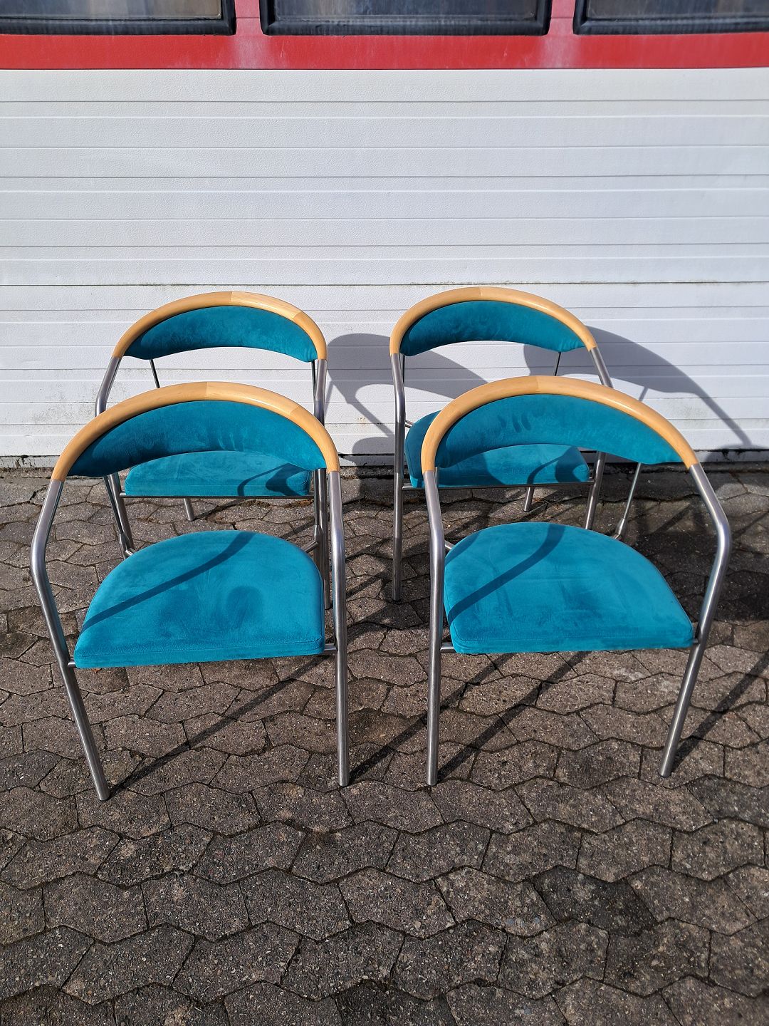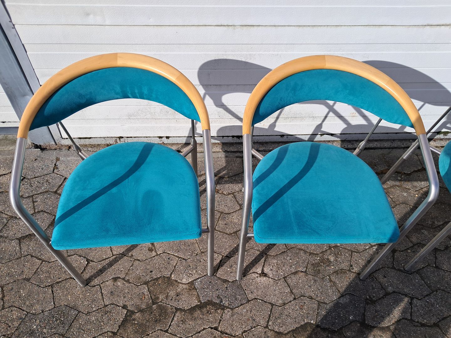 4 Chairman stole af Henrik Tengler i metal med turkis stofbetræk, fra 2000erne. De har brugsspor. Ryghøjde 76cm Sædehøjde 44cm Emne nummer: 77925