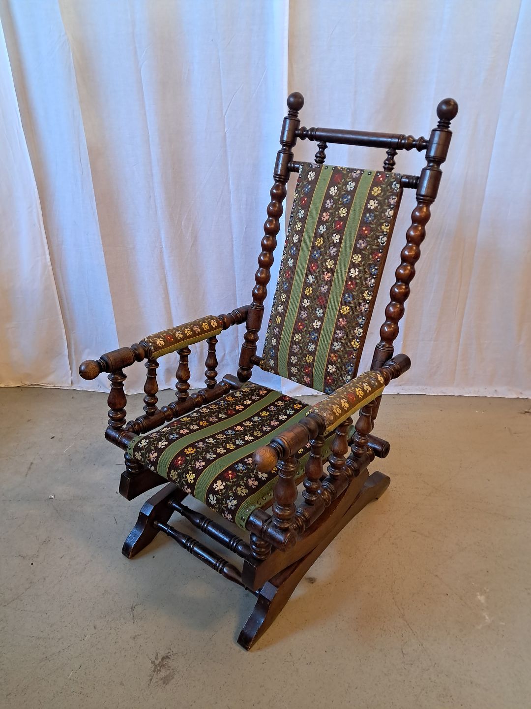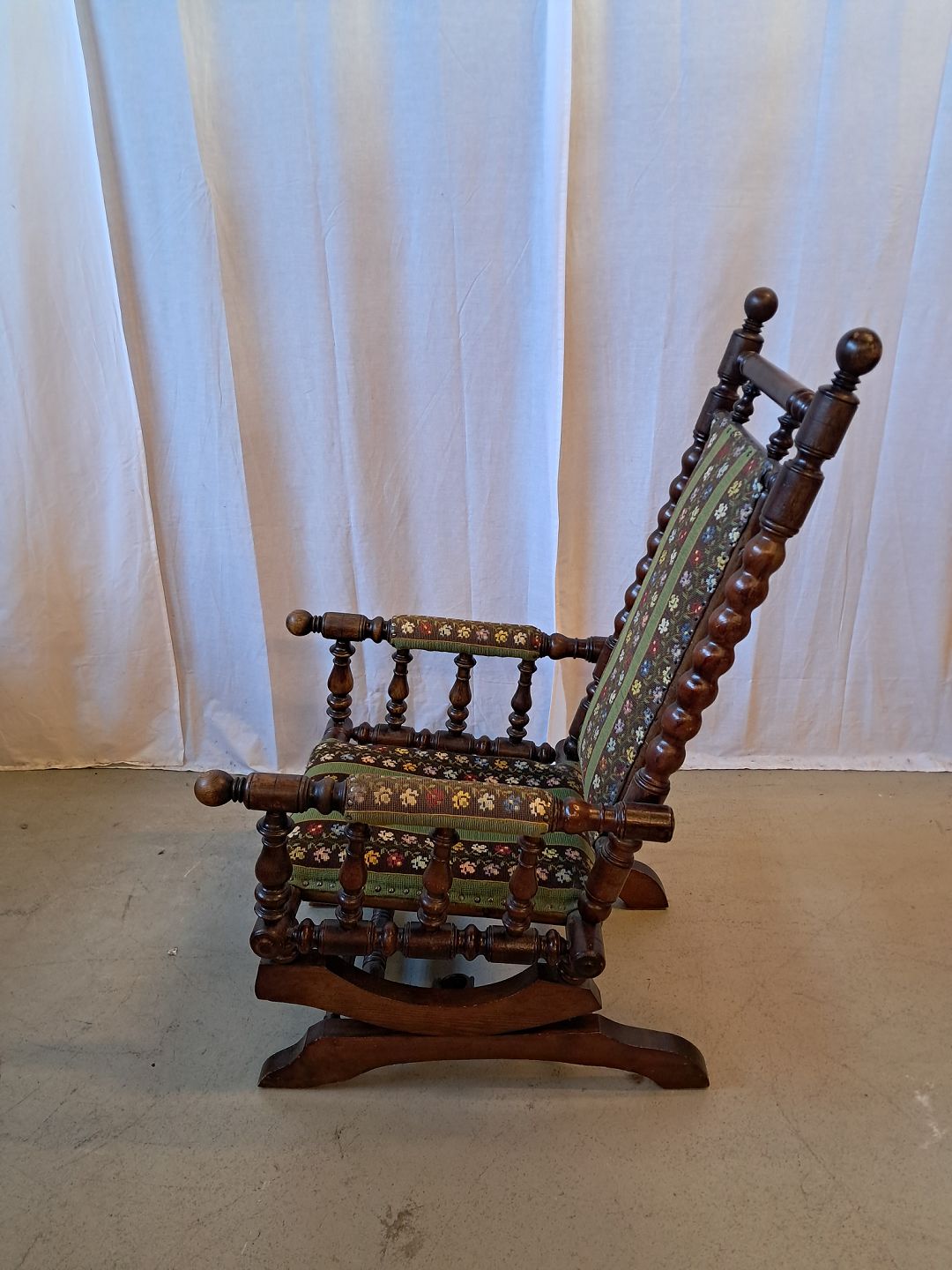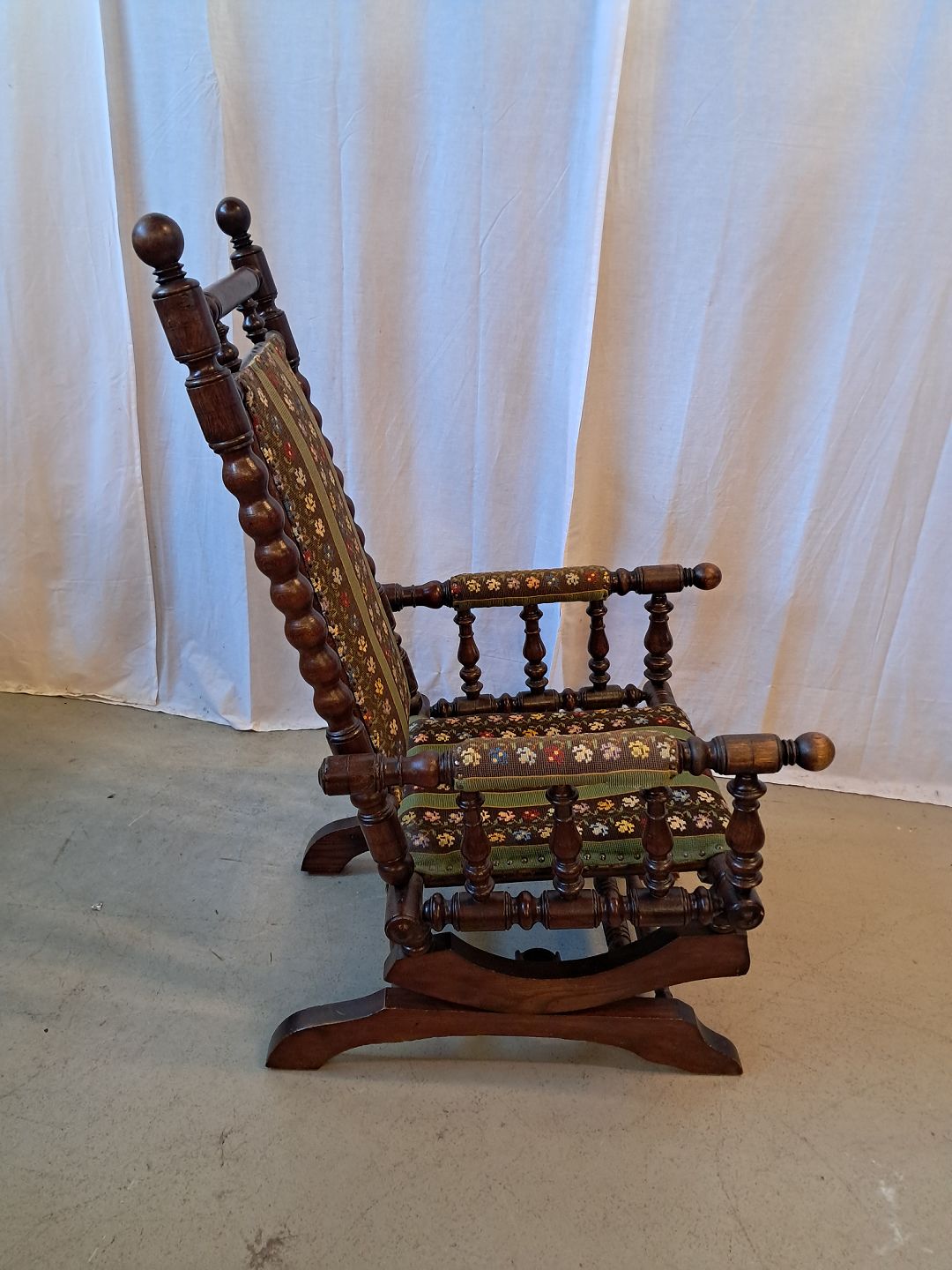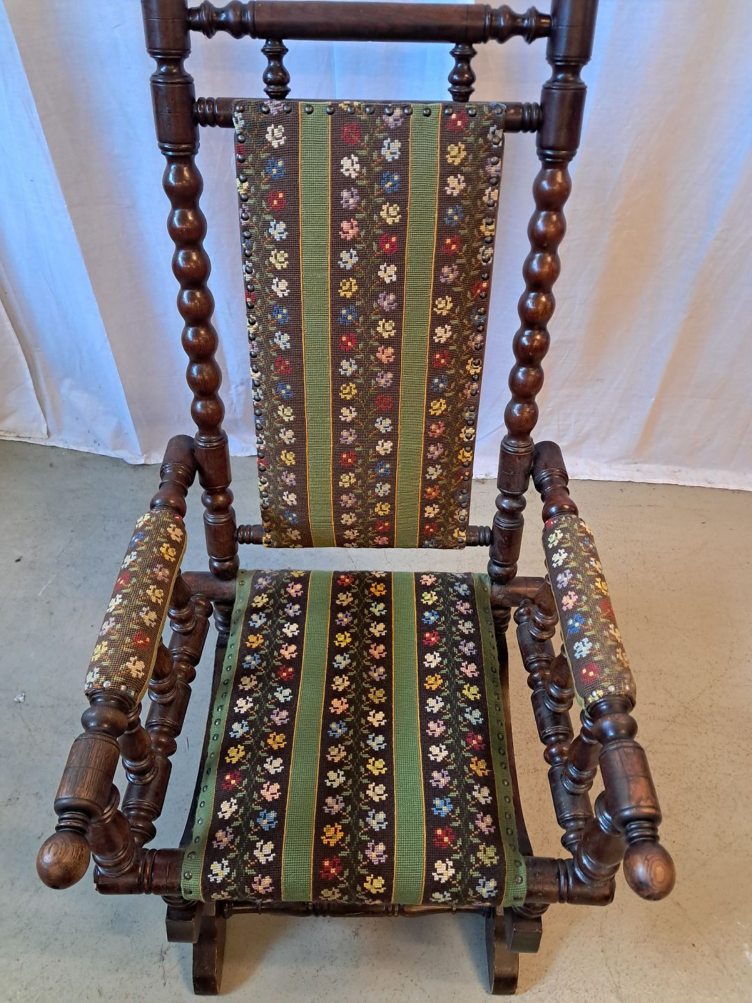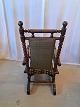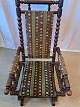 Rokkestol i massivt egetræ med broderet betræk, fra 1940erne. Den har brugsspor. Ryghøjde 109cm Sædehøjde 38cm Emne nummer: 78018