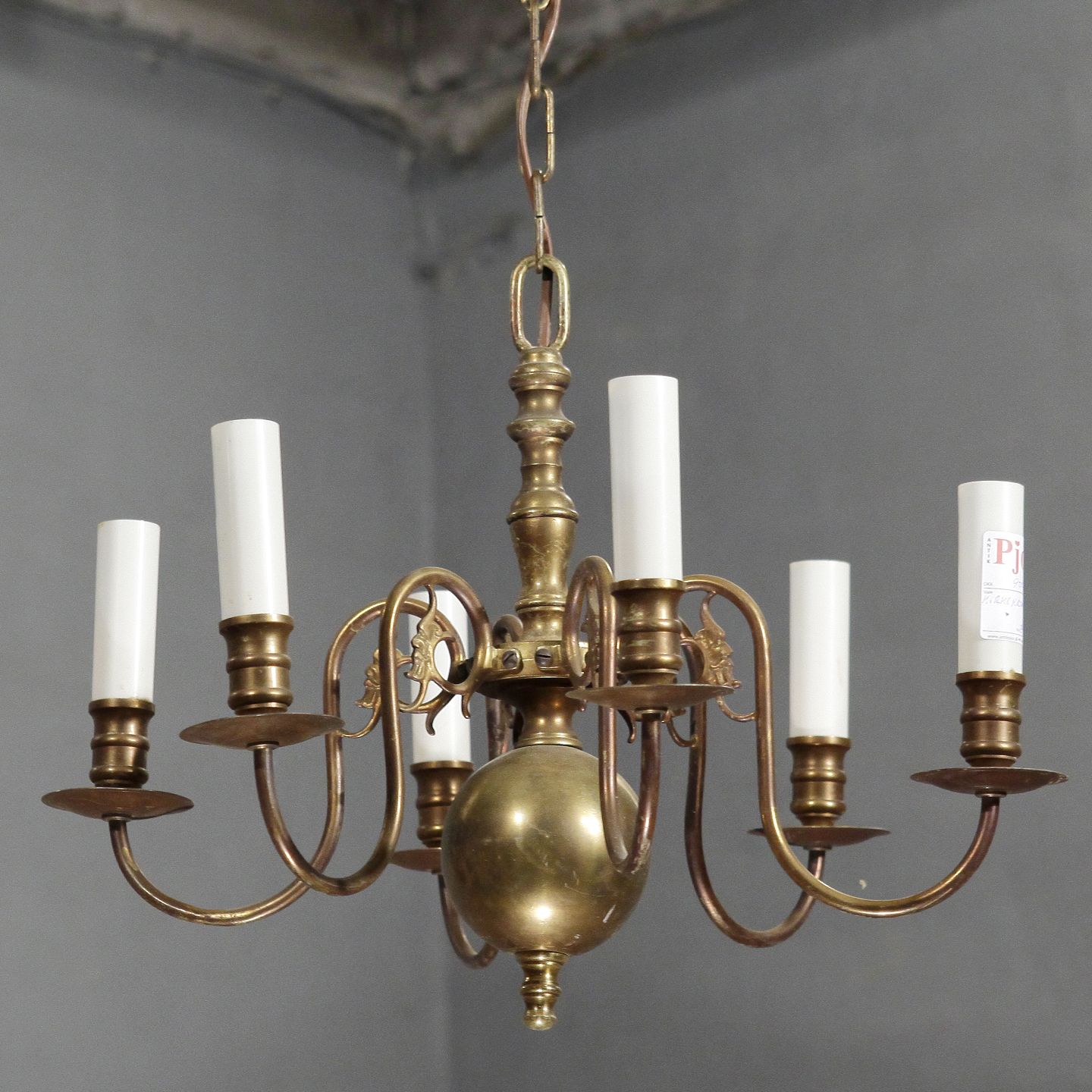 6-armet kirkekrone i bruneret messing, 47 cm i diameter, 1930-1940 Den har brugsspor og ledningen i kæden skal skiftes. Emne nummer: 24655