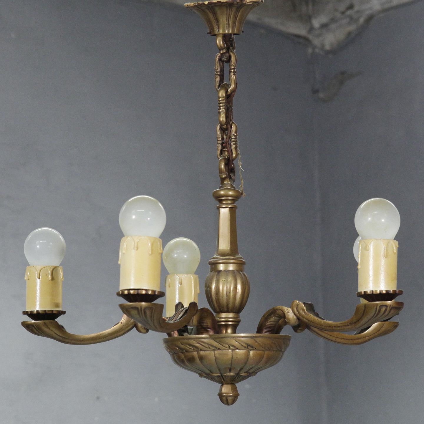 5-armet lysekrone i messing, 1930-1940