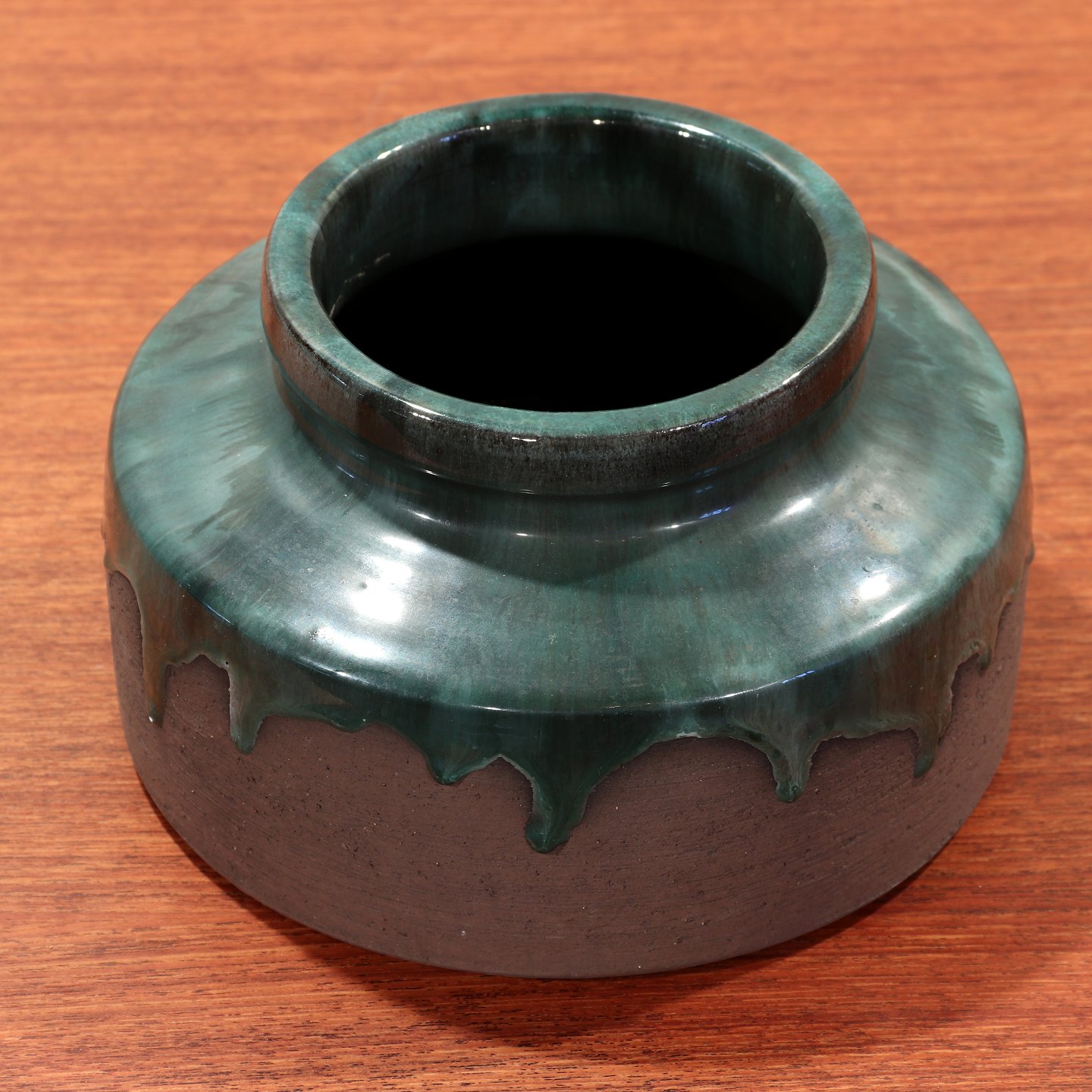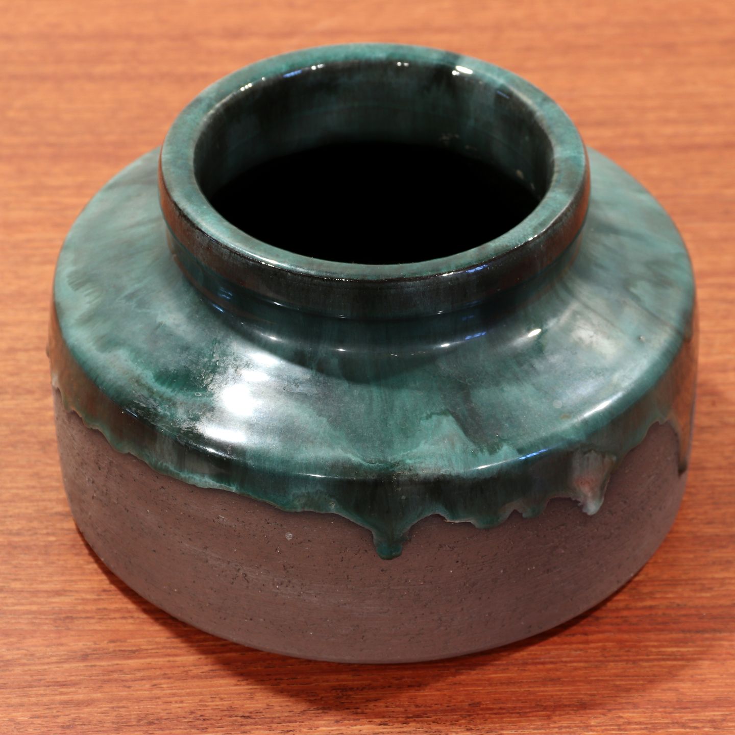 Vase i stentøj med løbeglasur utydeligt signeret i bunden. Højde 12,5 cm, diameter 21 cm. Emne nummer: 50372