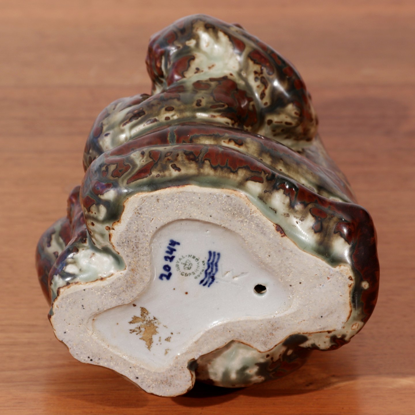 Knud Kyhn (f.1880-d.1969) figur af dreng med løveunge i stentøj glaseret med Sung glasur. Lavet hos Den kgl. Porceænsfabrik mellem 1969-1973. Højde 27 cm. 1. Sortering Emne nummer: 50393