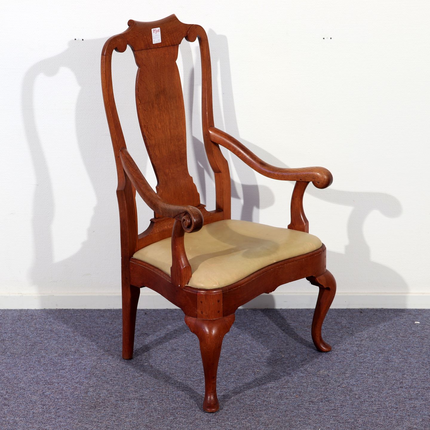 Armstol i bejdset egetræ, 116 cm høj, sædehøjde 43 cm, ca. 1920