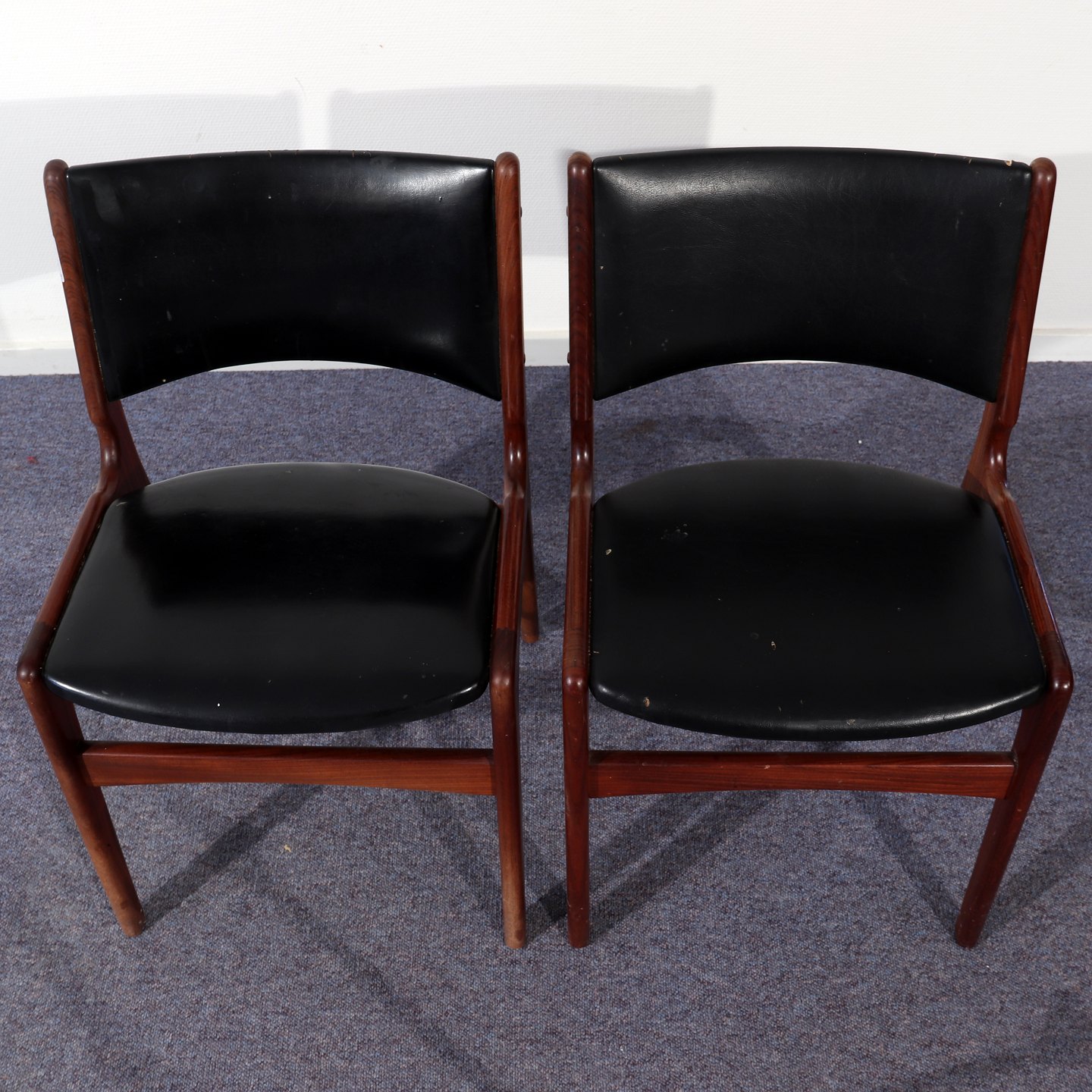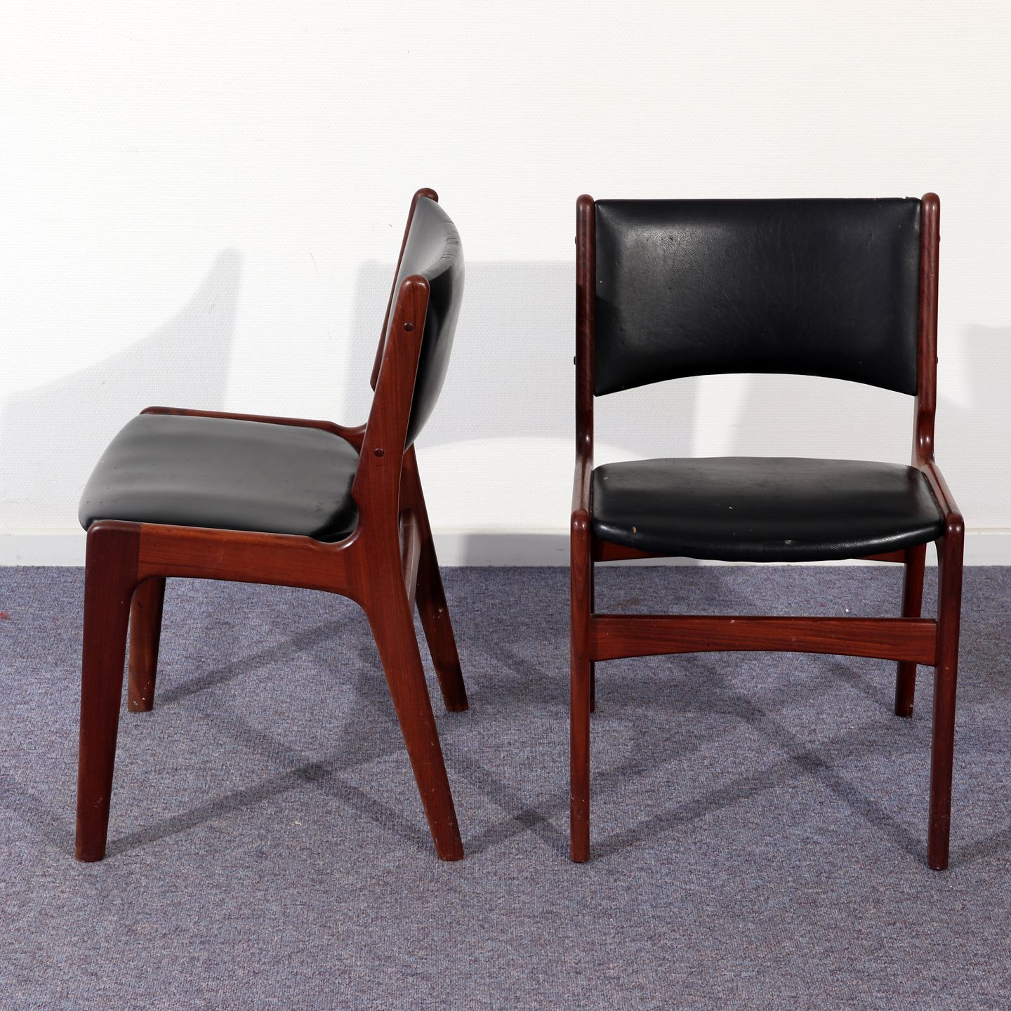 2 stole i teaktræ m. defekt sort nappa, 75 cm høje, sædehøjde 46 cm, ca. 1970