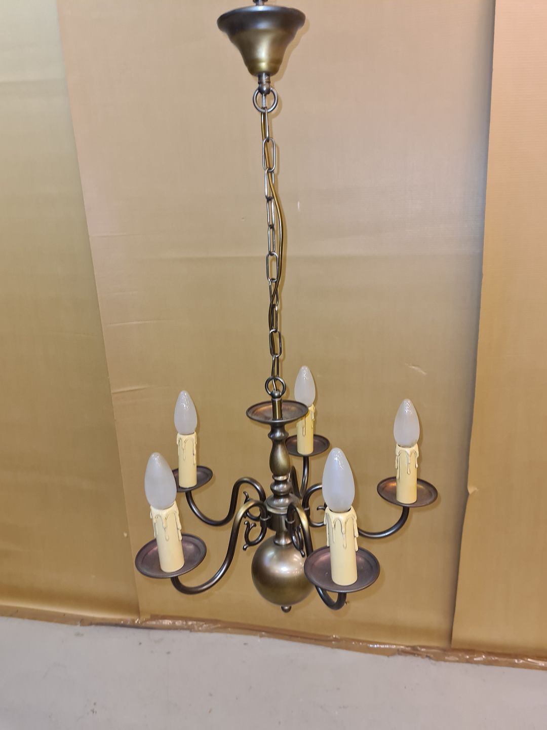 Nyere 5 armet kirkekrone. Fremstår fin og funktionsdygtig. Højde på billede 77 cm. Diameter 45 cm. Emne nummer: 60374