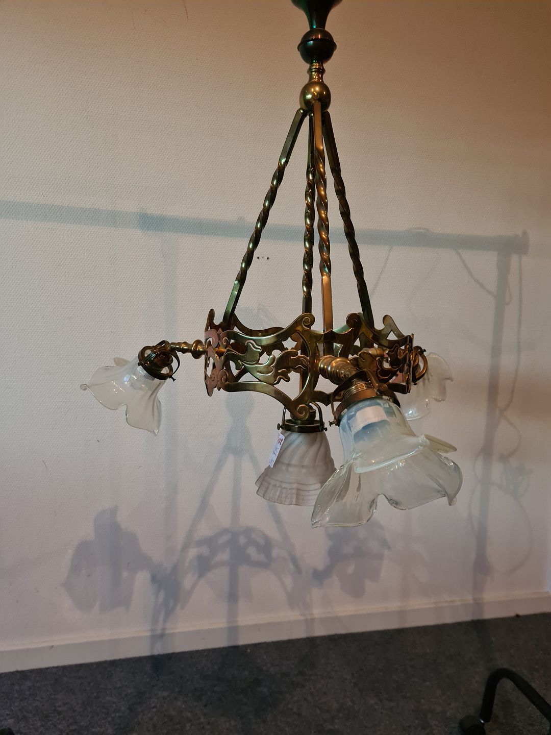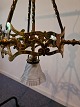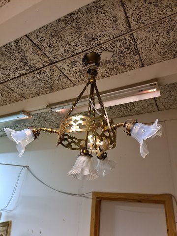 Messing lysekrone med 4 glas skærme fra 1920erne.