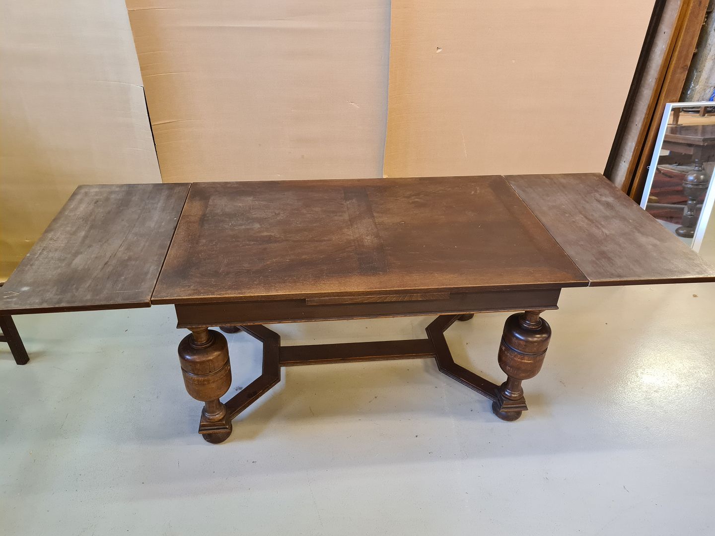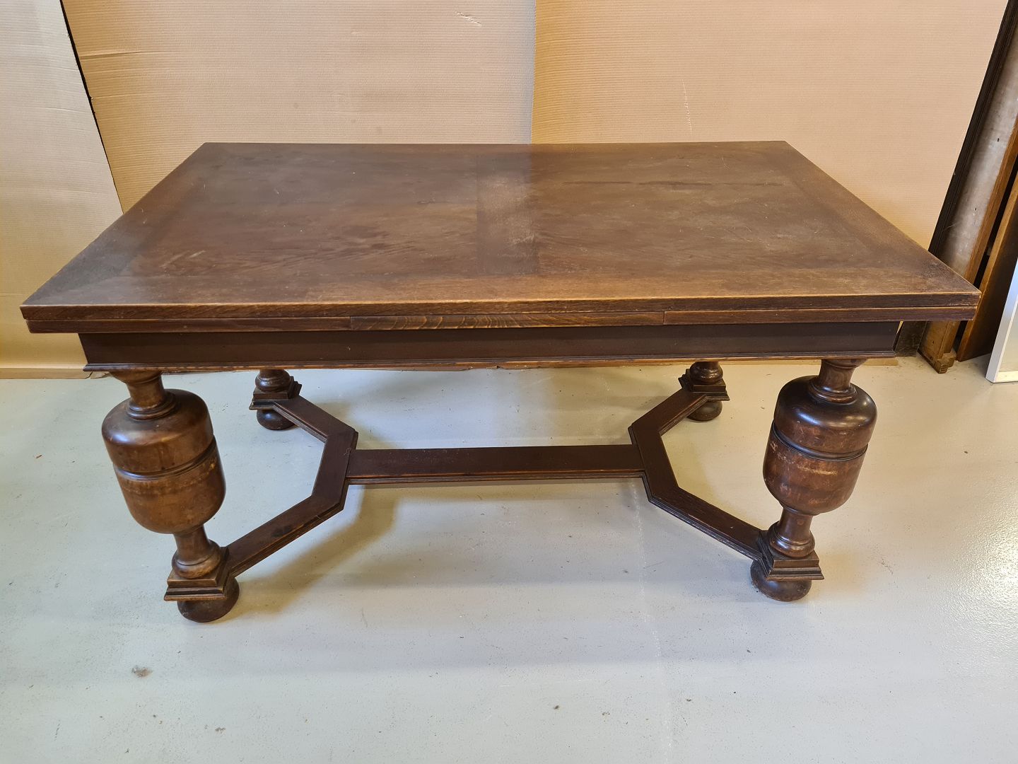 Egetræs spisebord med hollandsk udtræk fra 1930´erne. Fremstår funktionsdygtigt, godt og stabilt dog med en lille finérskade omtrent midt på bordpladen. HxLxB 76x144x89 cm. Længde med udtræk 138 cm. Emne nummer: 60434