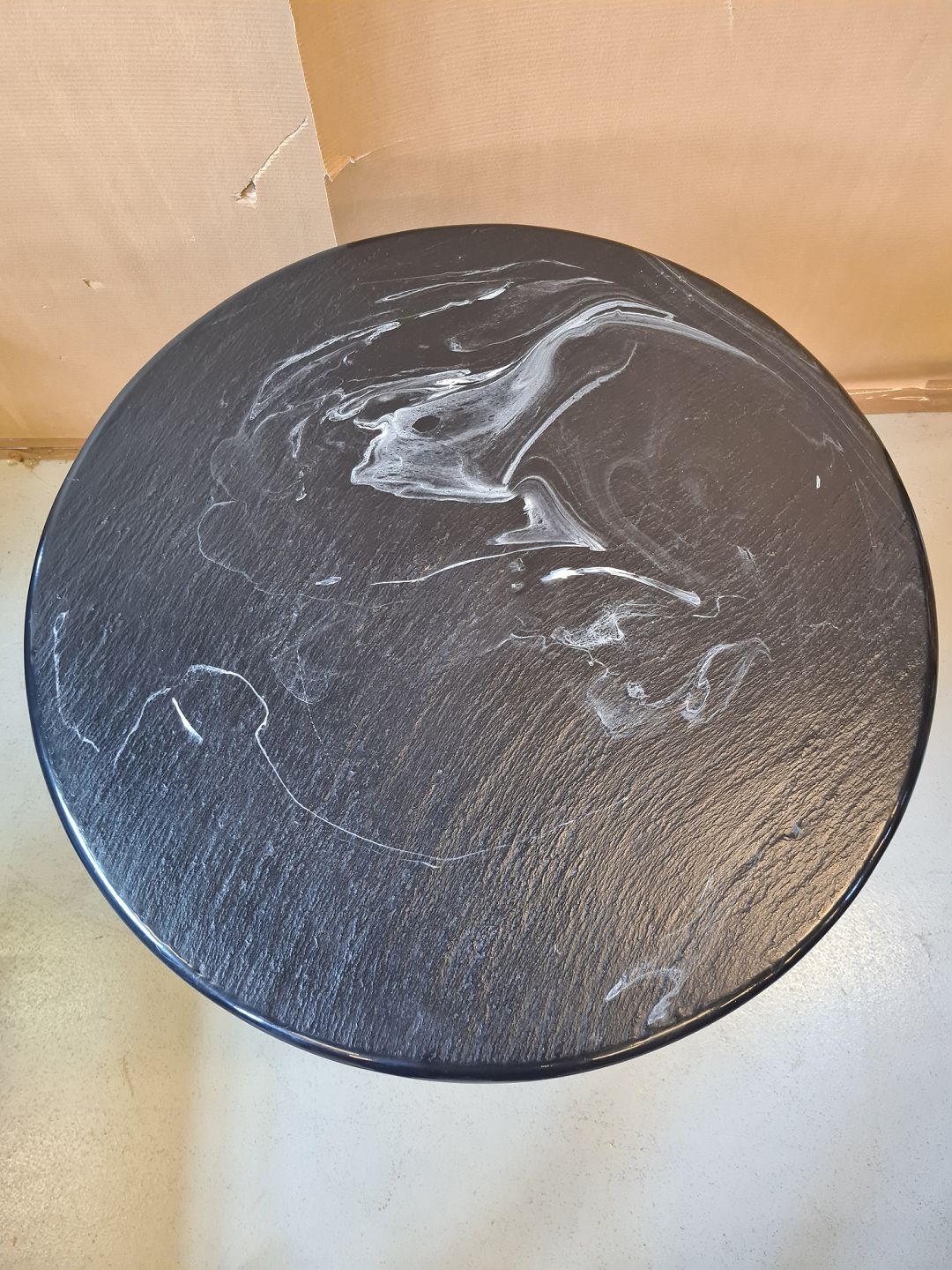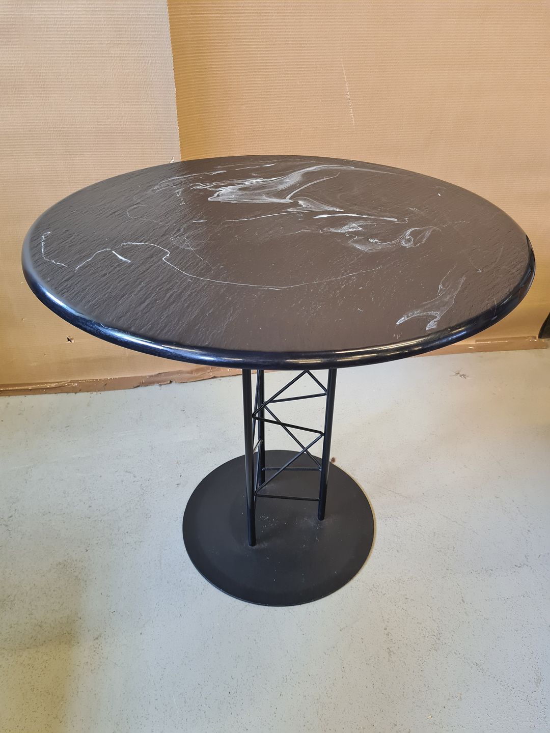 Rundt bord med malet metal stel og plade af stenmasse fra 1990erne.