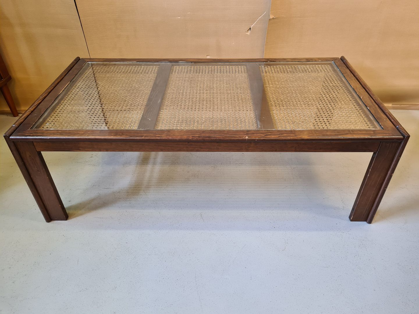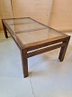 Sofabord i bejset og lakeret fyrretræ med flet og glasplade. Det har brugsspor. H 50cm B 78cm L 151cm Emne nummer: 71055