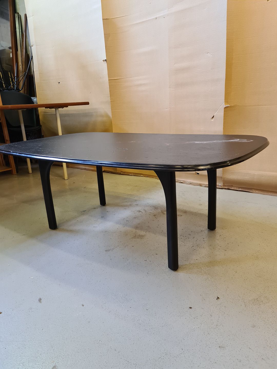 Sofabord med plade af støbt stenmasse og stel af støbt plast.