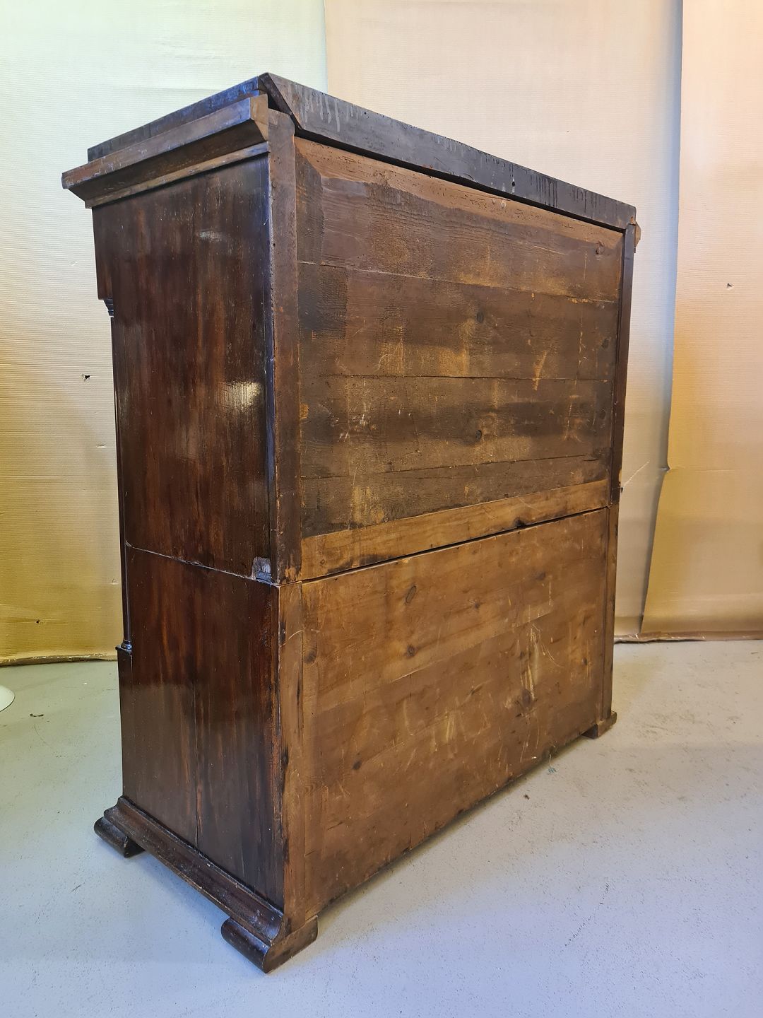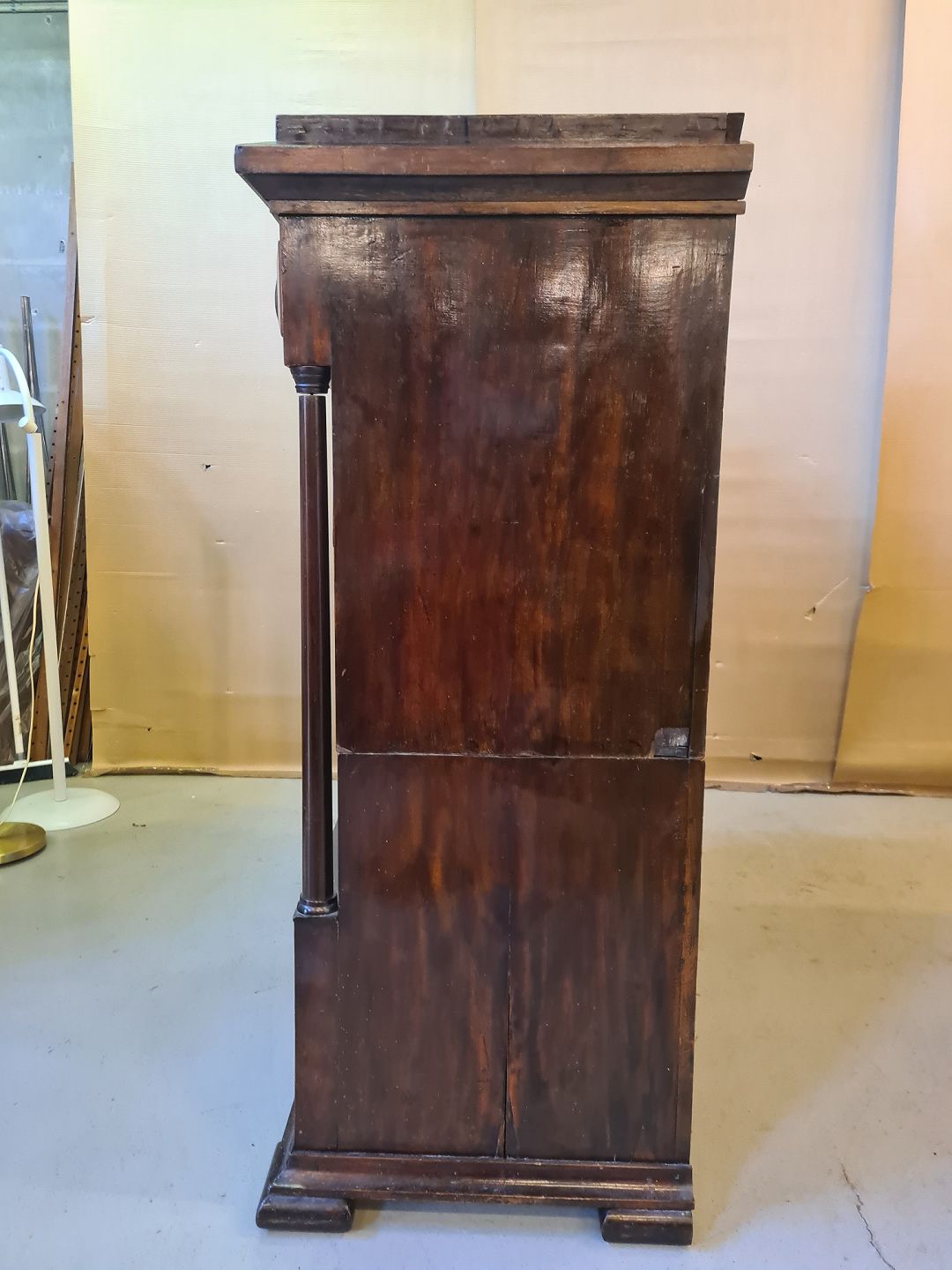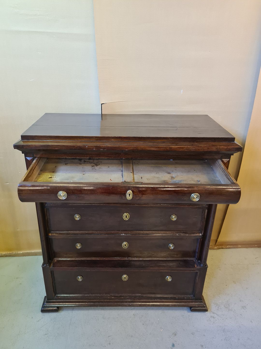 Dragkiste i fineret mahogni og bøgetræ, fra 1890erne. Den har brugsspor. H 136cm B 123cm D 55cm Emne nummer: 72518