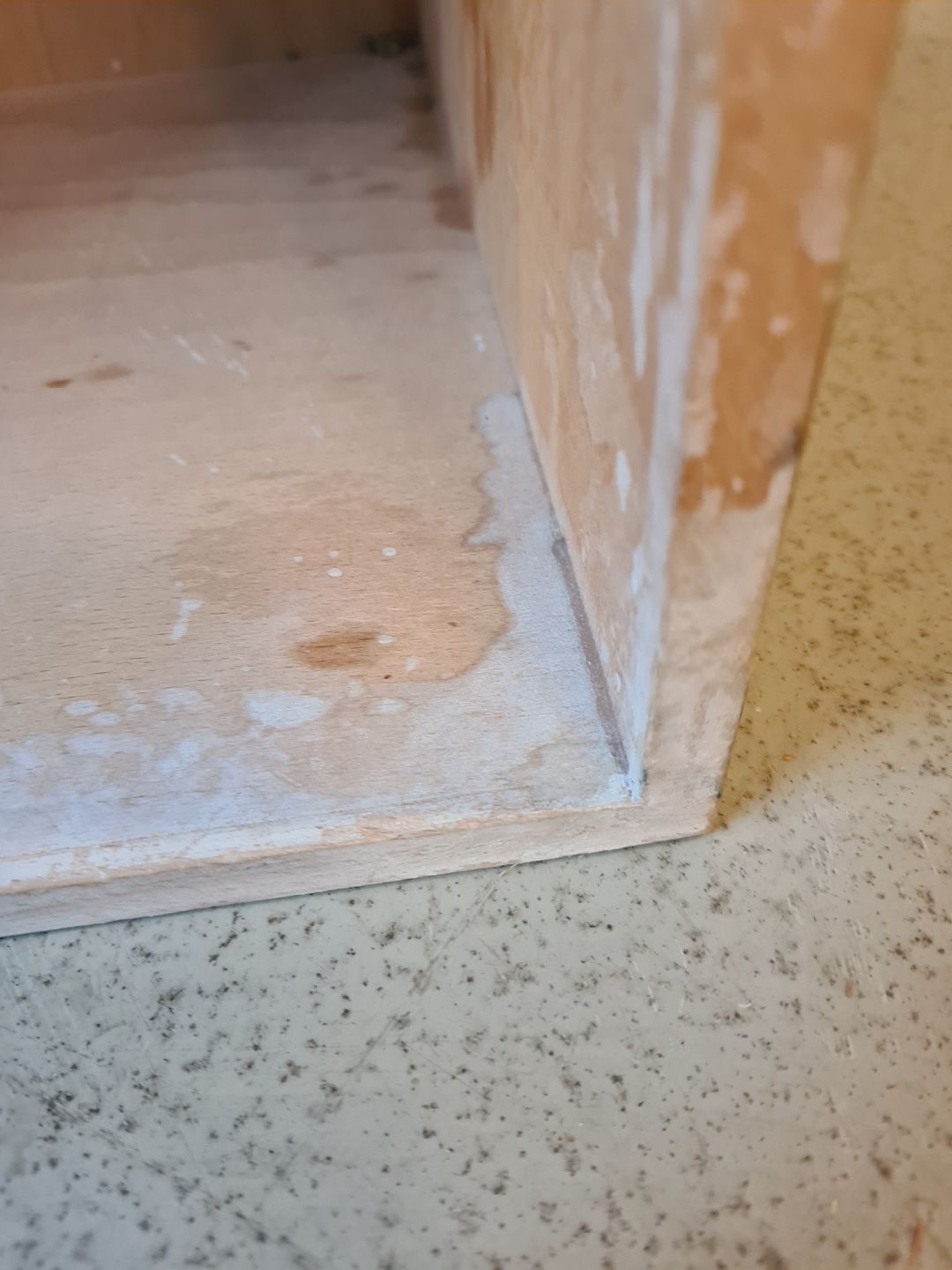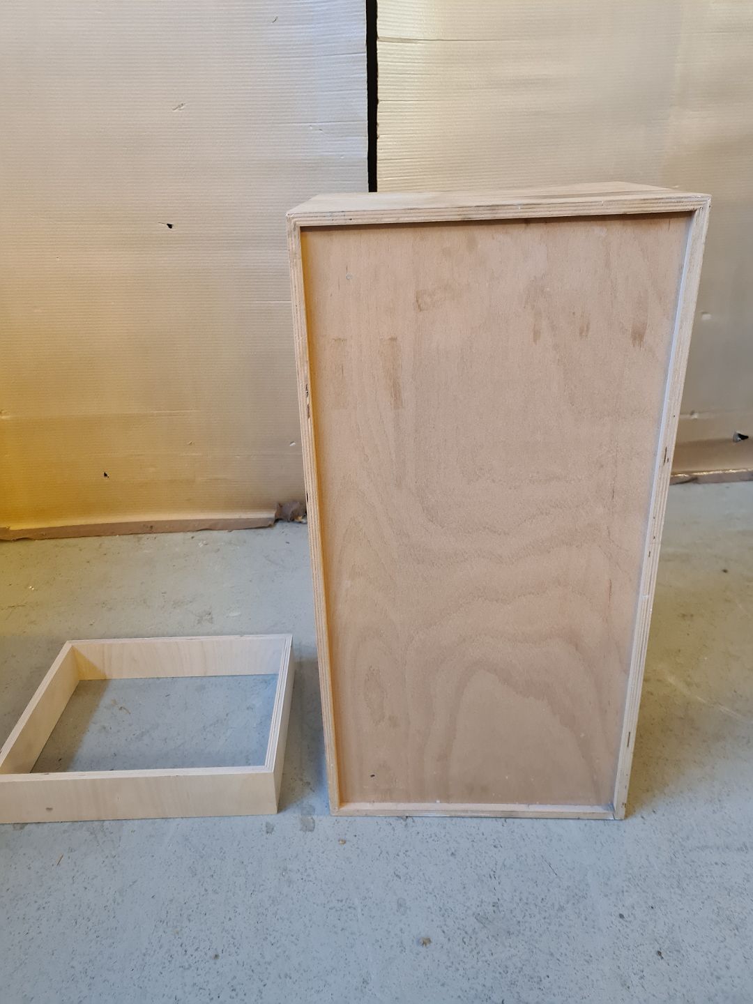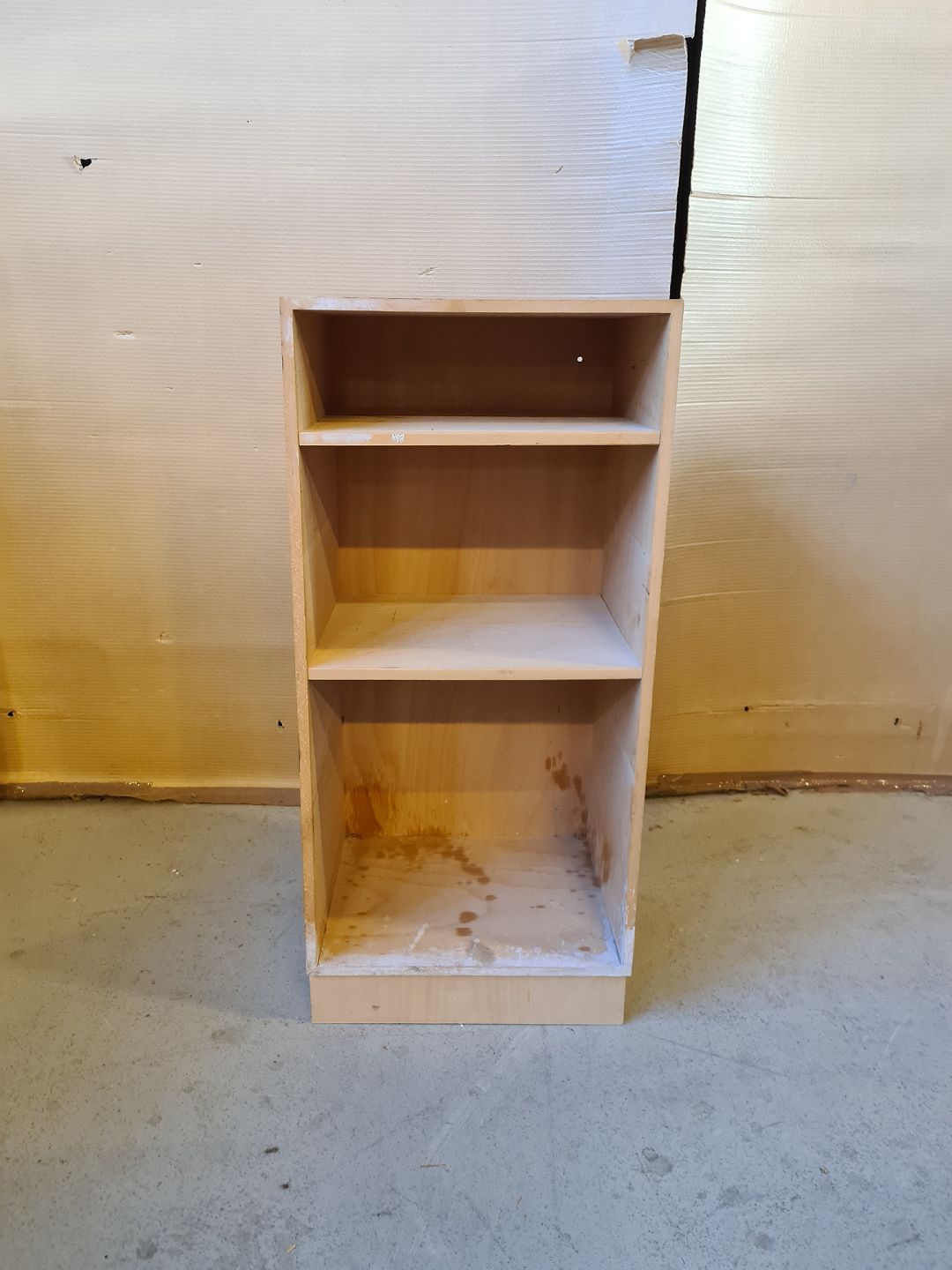 Reol i krydsfiner med sokkel, fra 2000erne. Den har brugsspor. H 70cm B 35,5cm D 30cm Sokkel højde 30cm Emne nummer: 72641