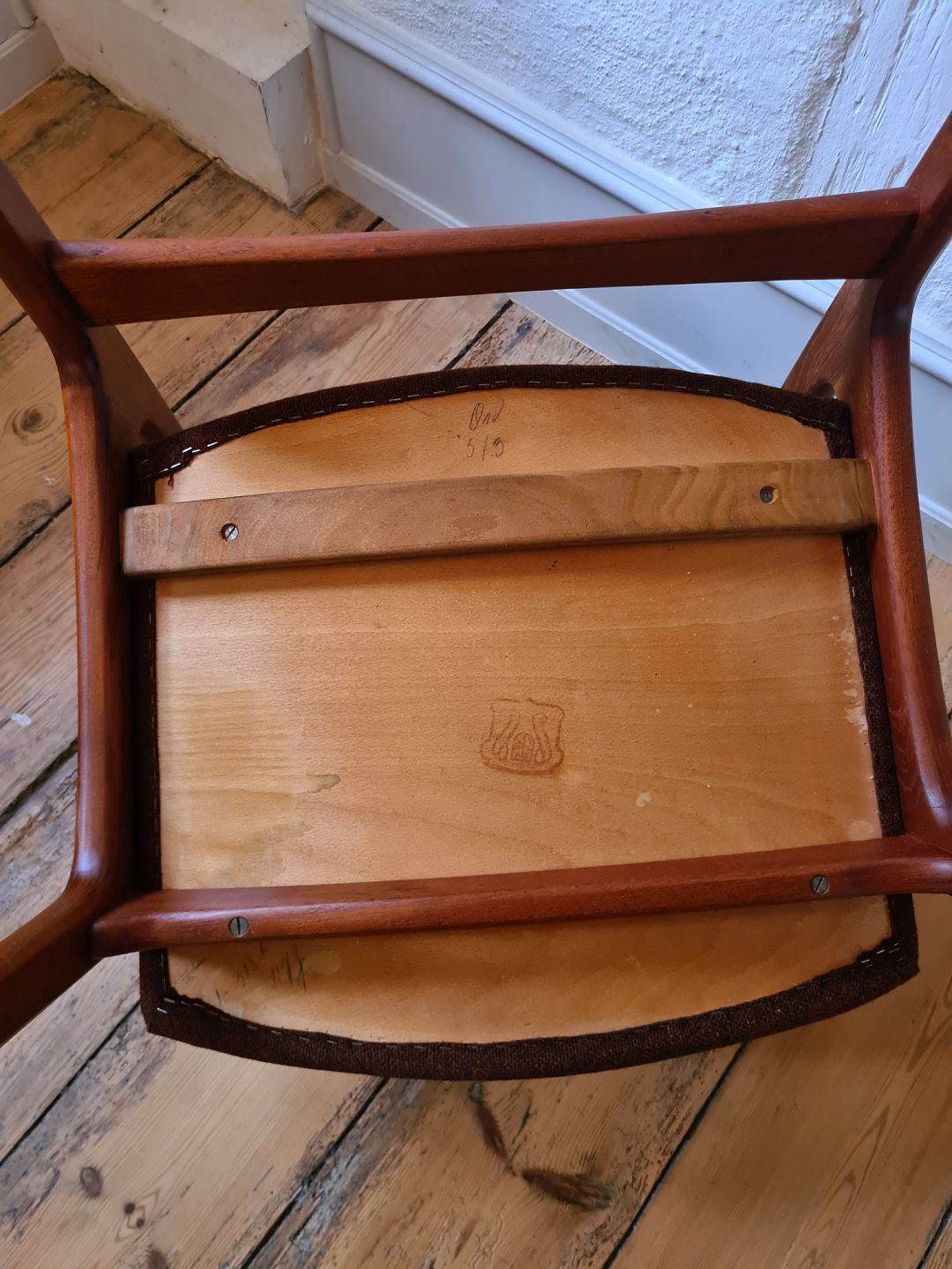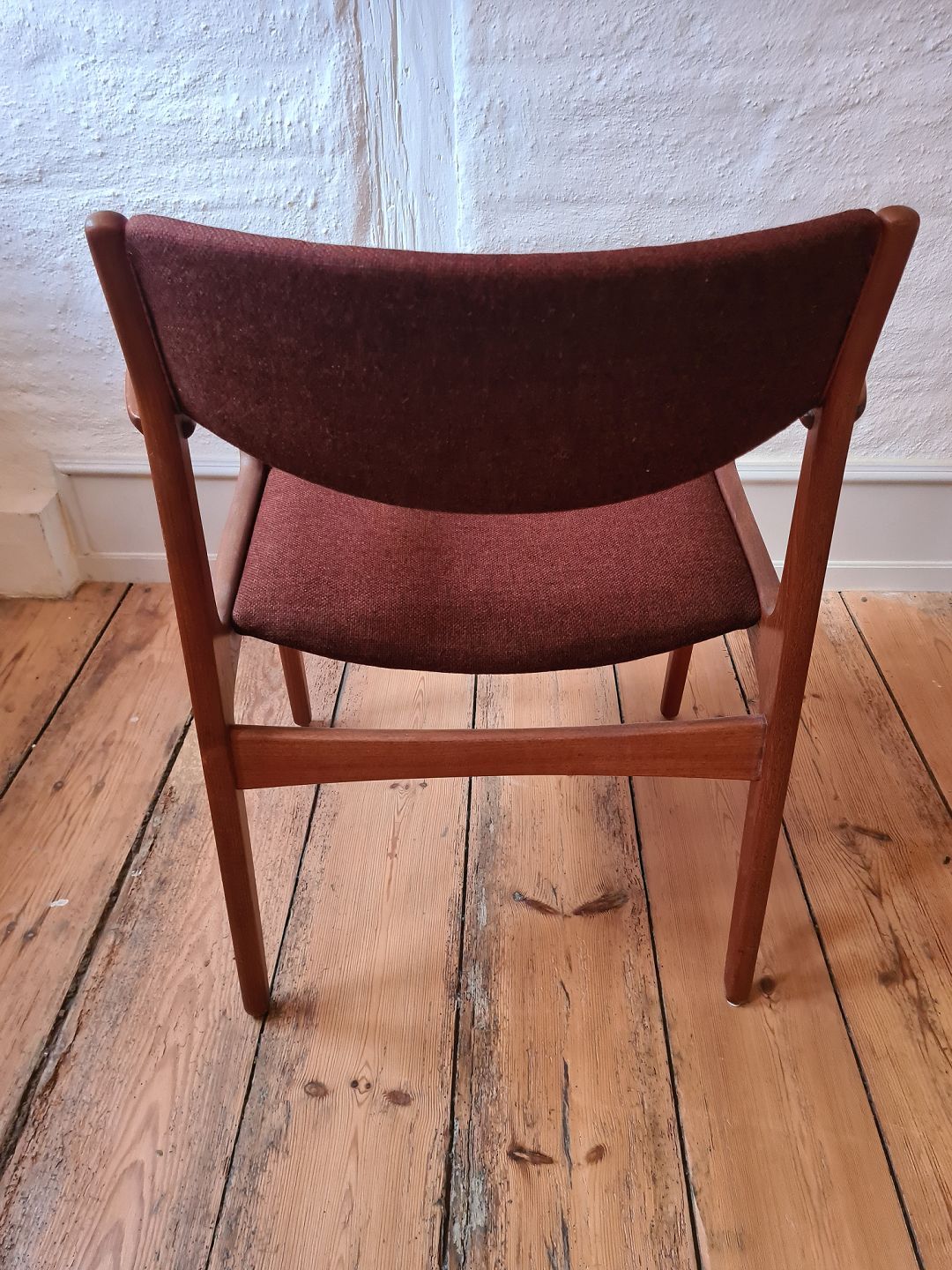 Armstol i teak med rødt betræk. Fremstillet i 1960´erne. Fremstår udmærket stabil og velholdt uden nævneværdige brugsspor.