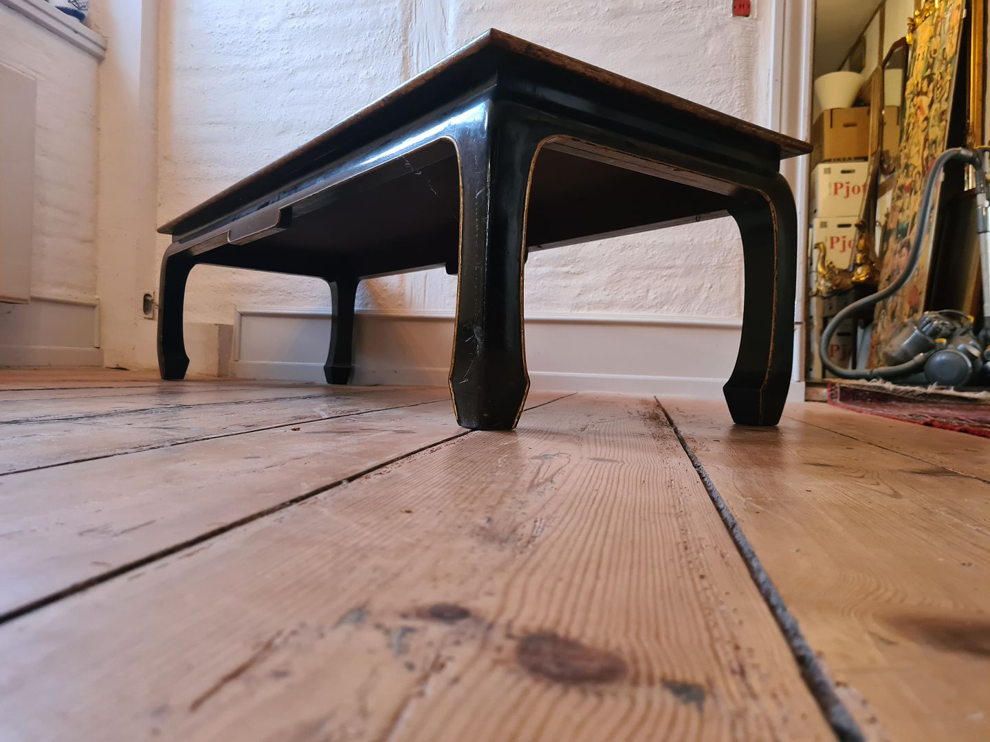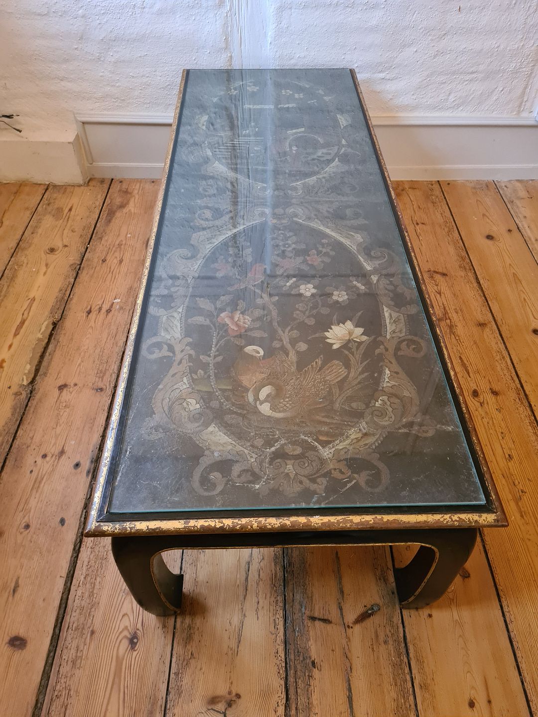 Orientalsk sofabord med glasplade, bestående af håndmalet panel fra 1700 tallet på nyere bordstel fra 1920´erne. Fremstår virkelig flot og velholdt. HxLxB 41x157x56 cm. Emne nummer: 80220