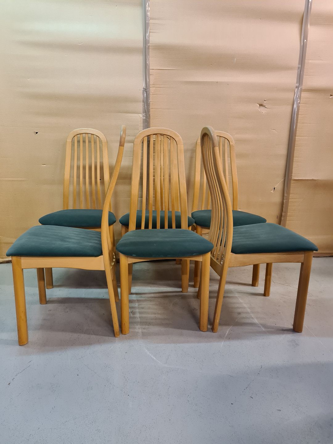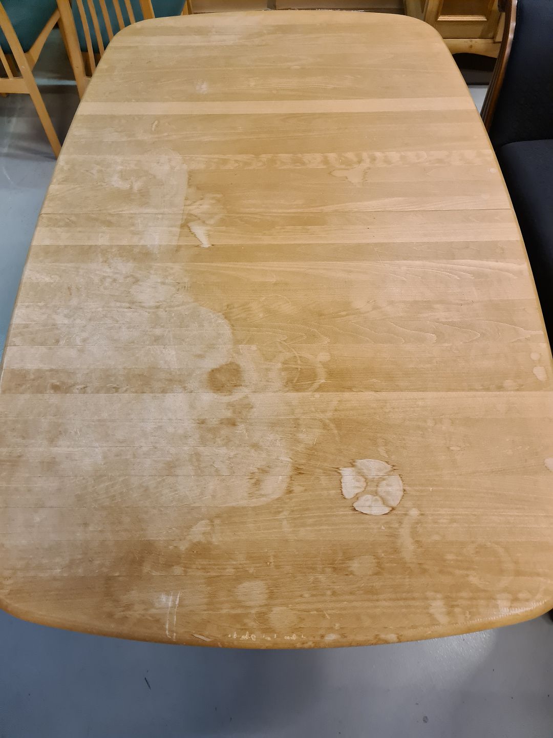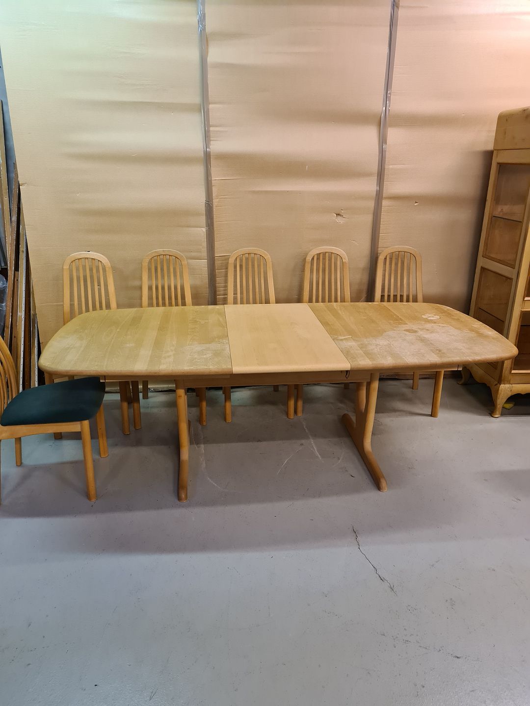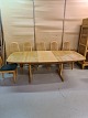 Spisebord med 1 tillægsplade og 6 stole i massivt bøgetræ, fra 2000erne. Bordpladen trænger til en slibning. Bord mål : h 72cm B 105cm L 172cm Længde med tillægspladen 222cm Emne nummer: 72967