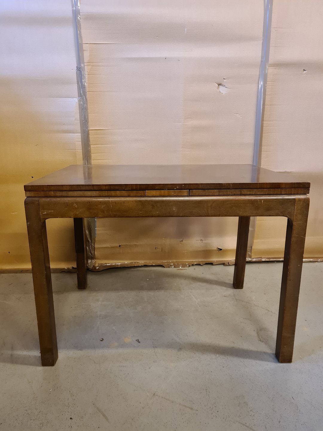 Spisebord i fineret birketræ, fra 1930erne. Det har brugsspor og udtrækket er noget skævt. H 74cm B 70cm L 100cm Længde med udtræk 184cm Emne nummer: 73177