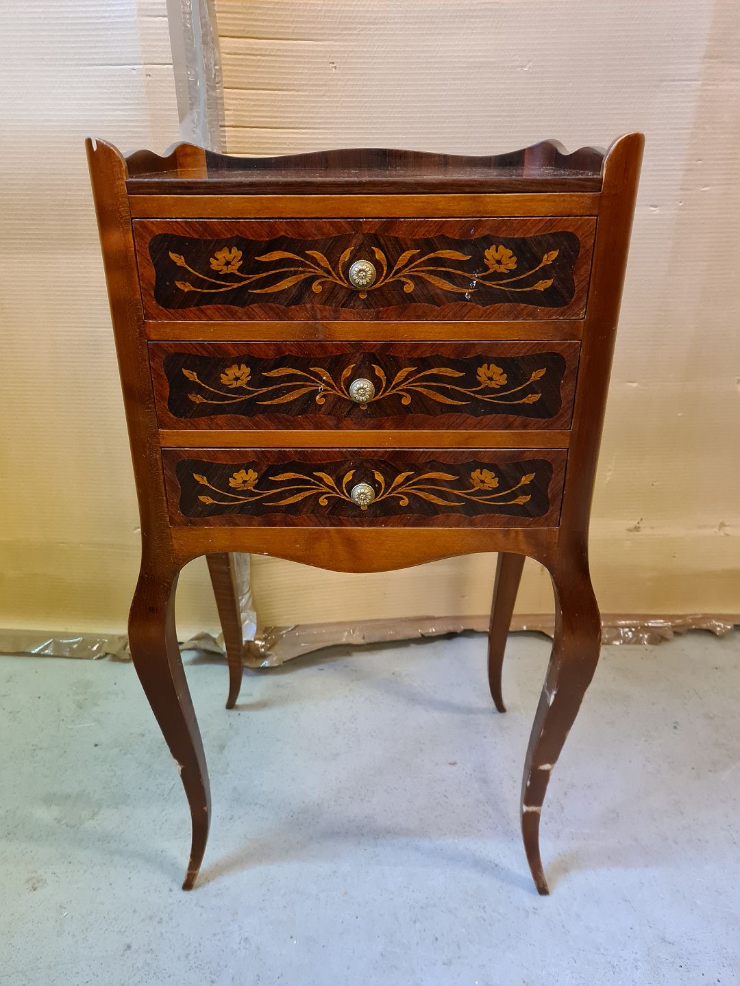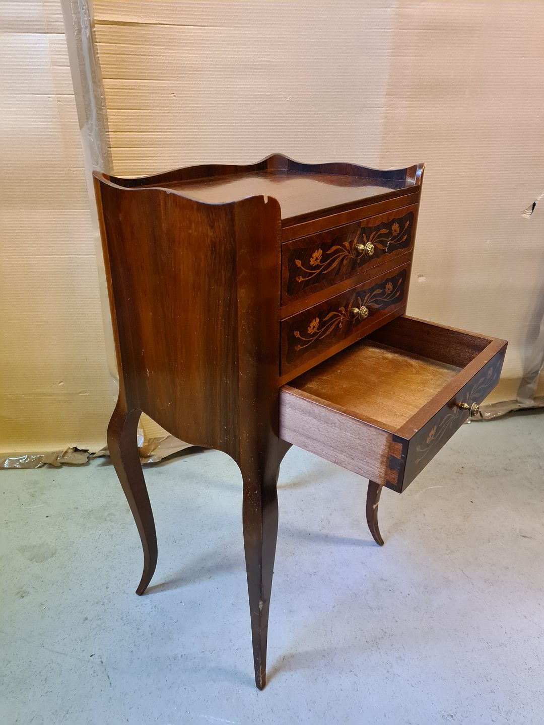 Lille kommode med intarsia i palisander og bøgetræ, fra 1980erne. H 72cm B 39cm D 28cm Emne nummer: 73245
