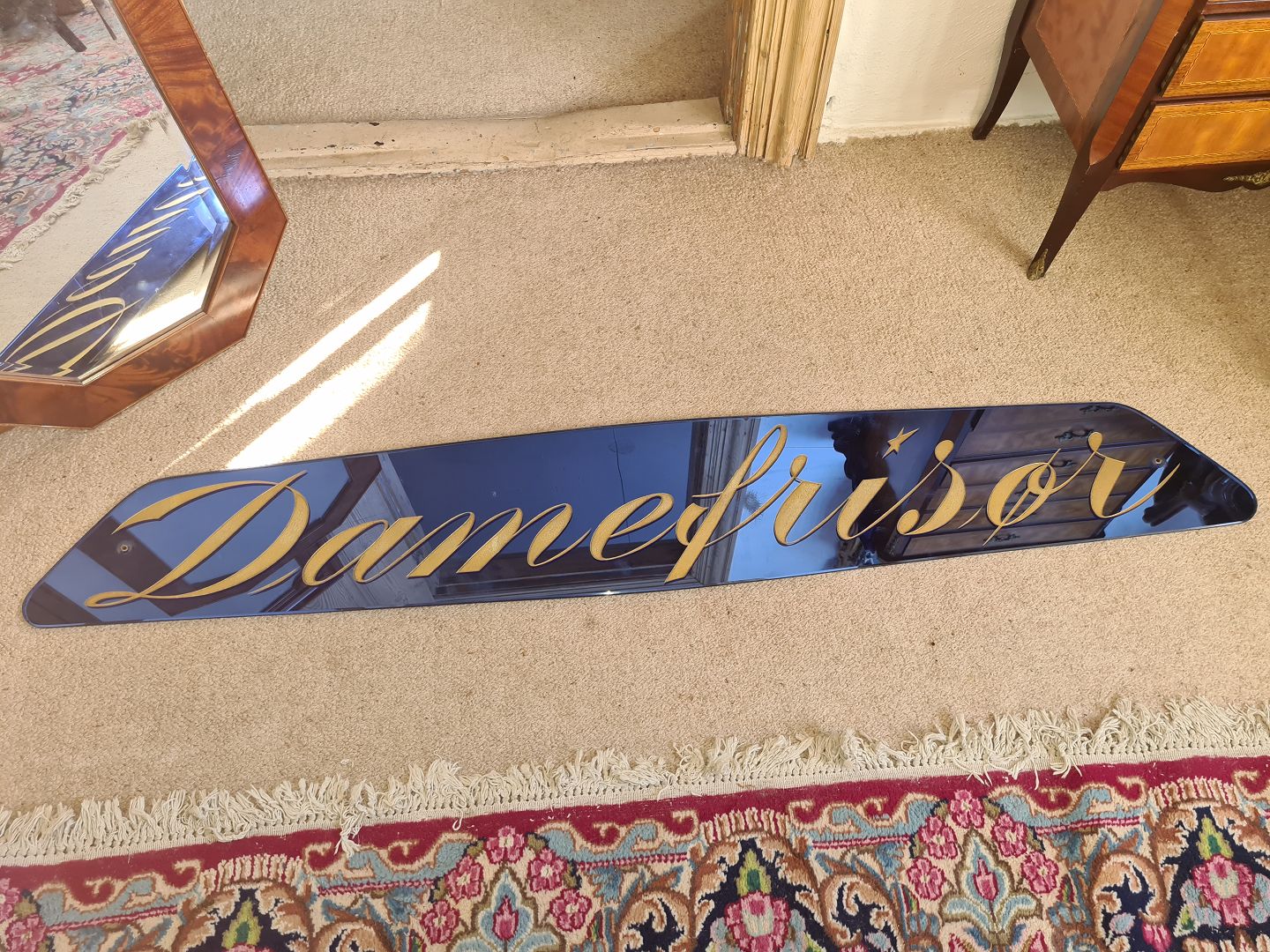 Skønt gammelt Damefrisør skilt fra 1950´erne i blåt glas med guldbogstaver. Fremstår flot uden afslag af nogen art.