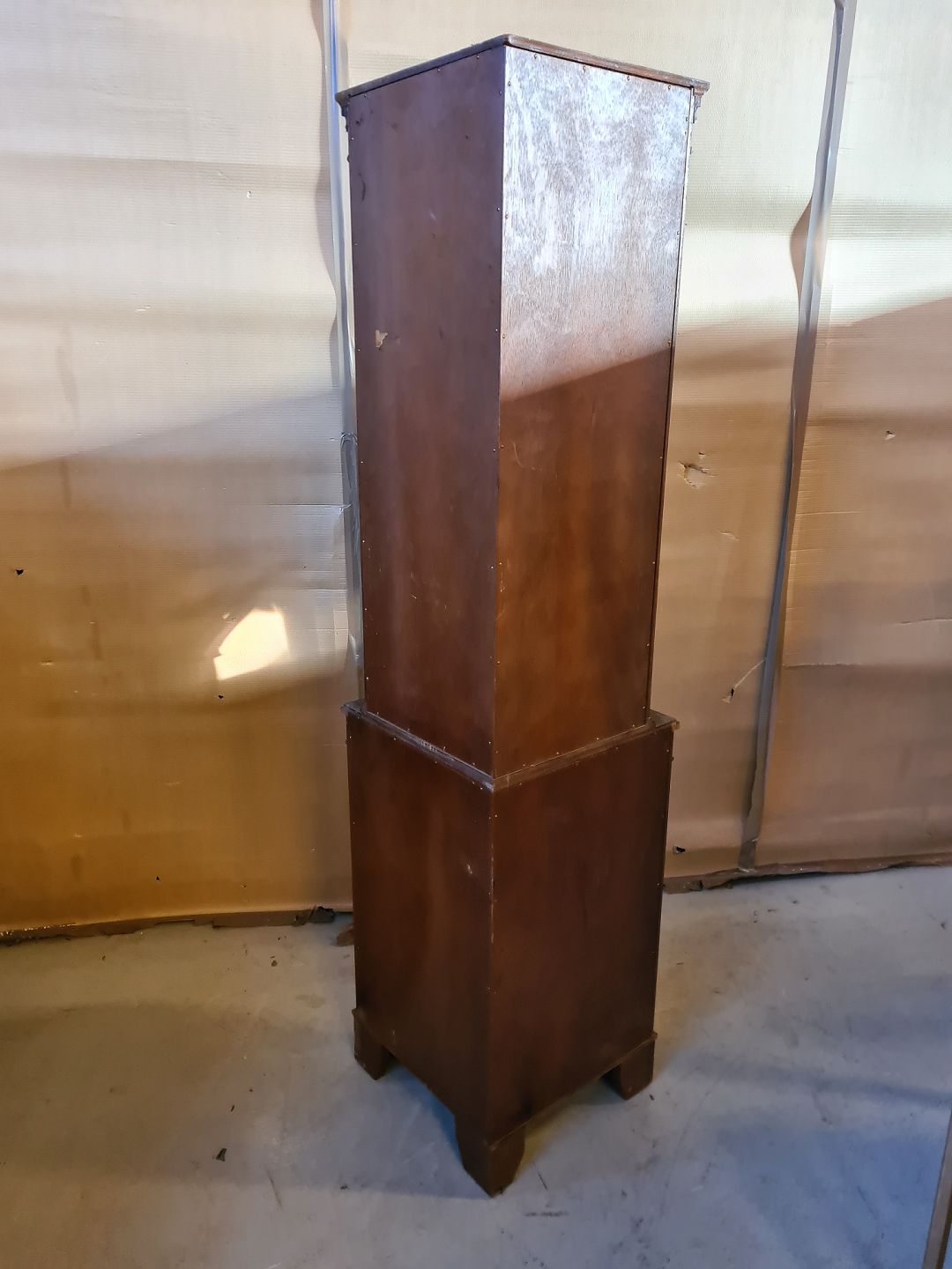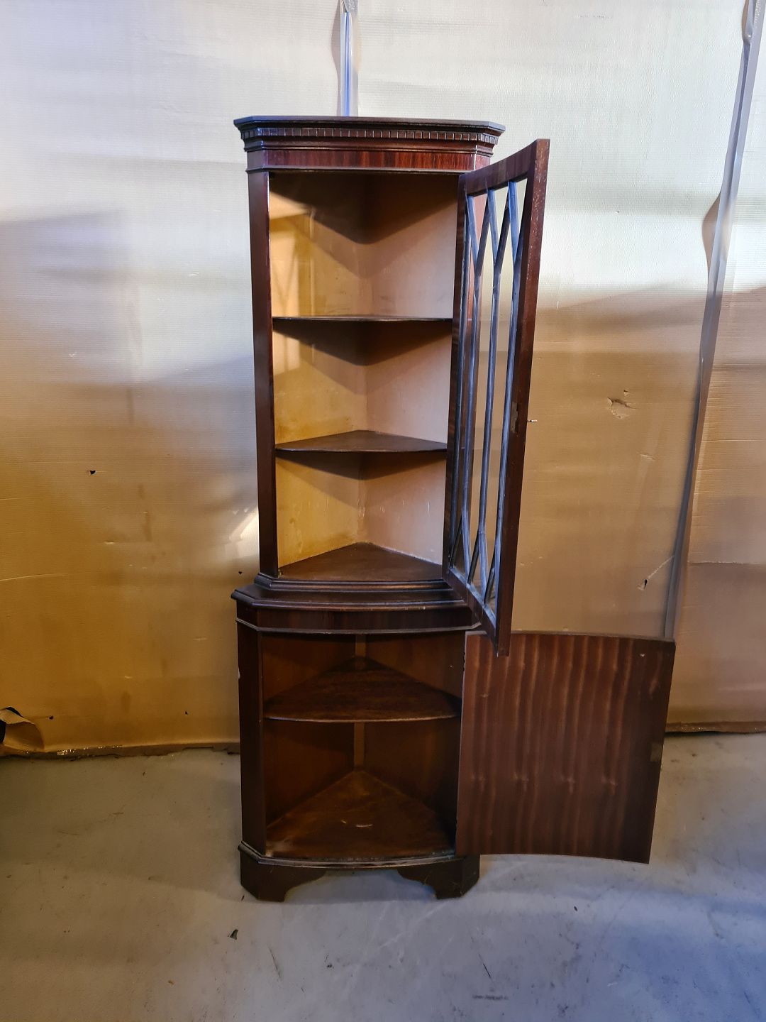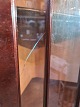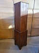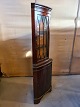 Hjørneskab i fineret mahogni, fra 1980erne. Det har brugsspor og en revne i glaslågen. Højde 186cm De 2 dybder er 46cm (Bredde 64cm) Emne nummer: 73471