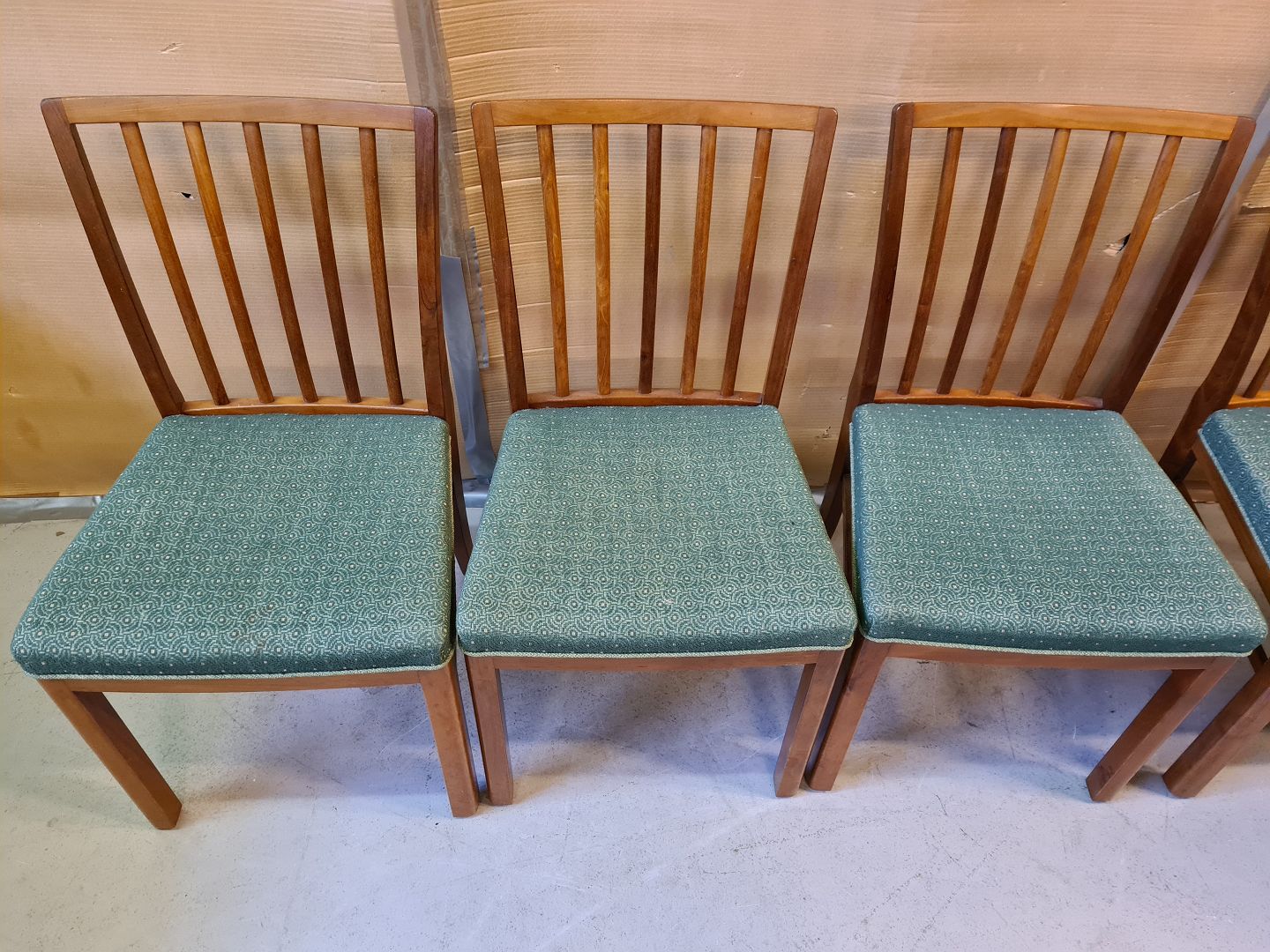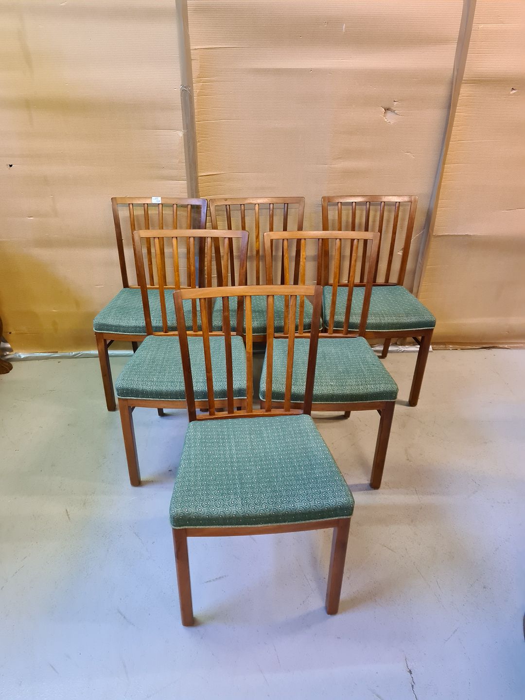 6 Stole i massivt mahogni, fra 1950erne. Betrækket er slidt, men brugbart. Højde 85cm Sædehøjde 46cm Emne nummer: 73489