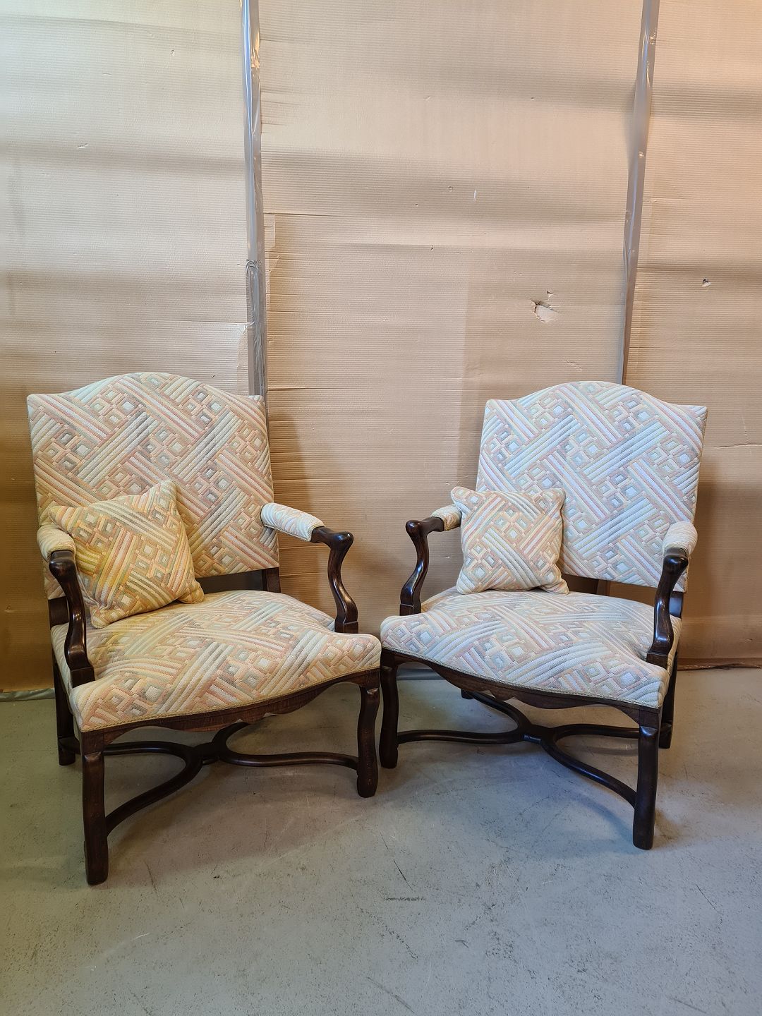 2 Armstole i bejdset birketræ, fra 1950erne. De har slid på armlæn og der medfølger 2 små puder. Højde 97cm Sædehøjde 40cm Emne nummer: 73499