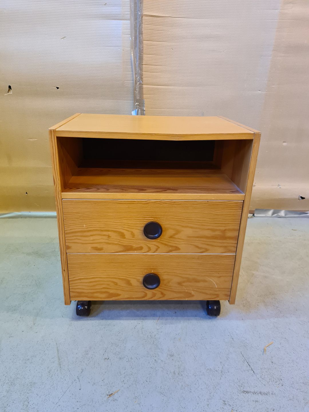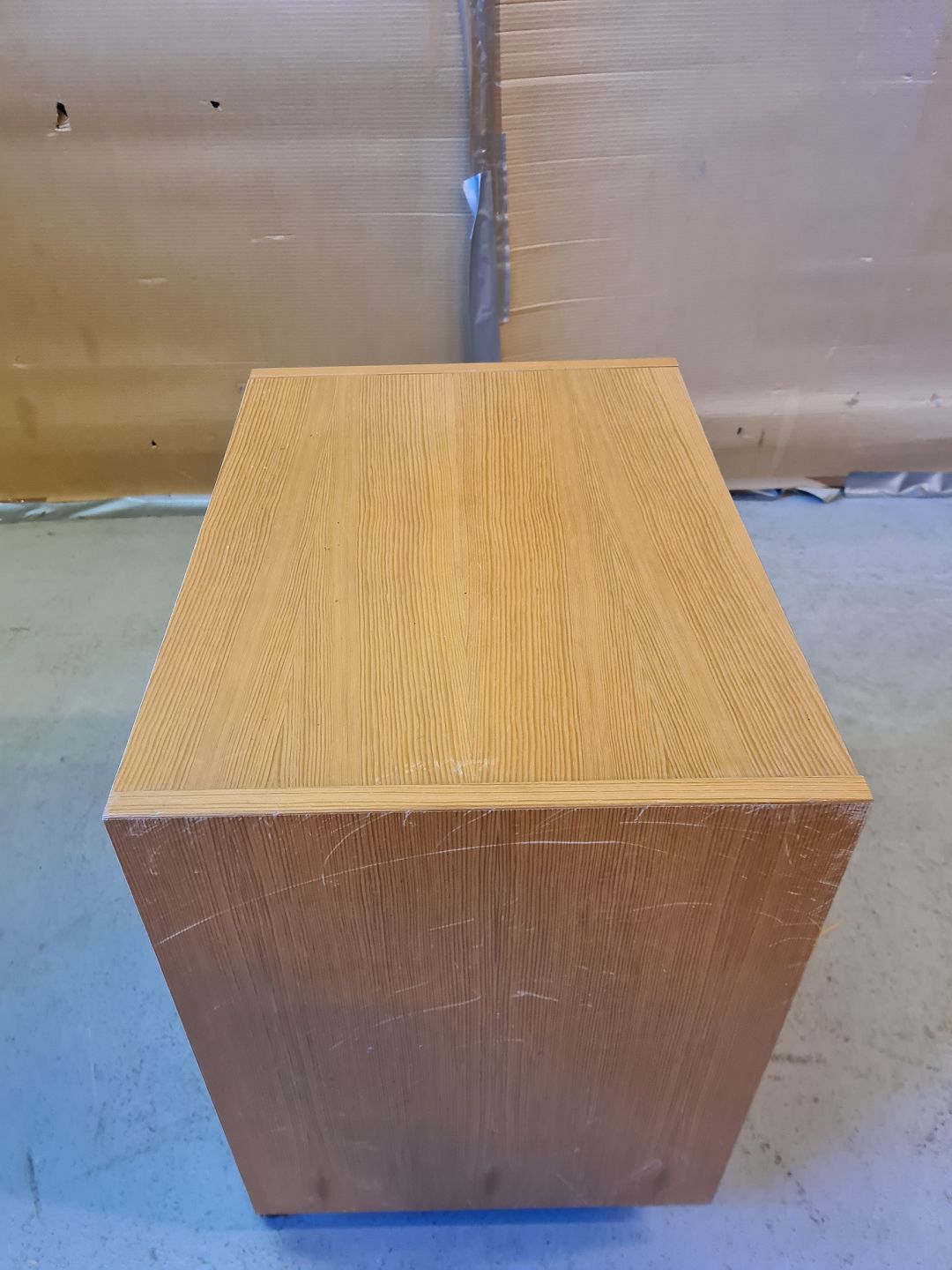 Lille møbel på hjul i fineret fyrretræ, fra 1980erne. Det har brugsspor. H 57cm B 50cm D 37cm Emne nummer: 73629