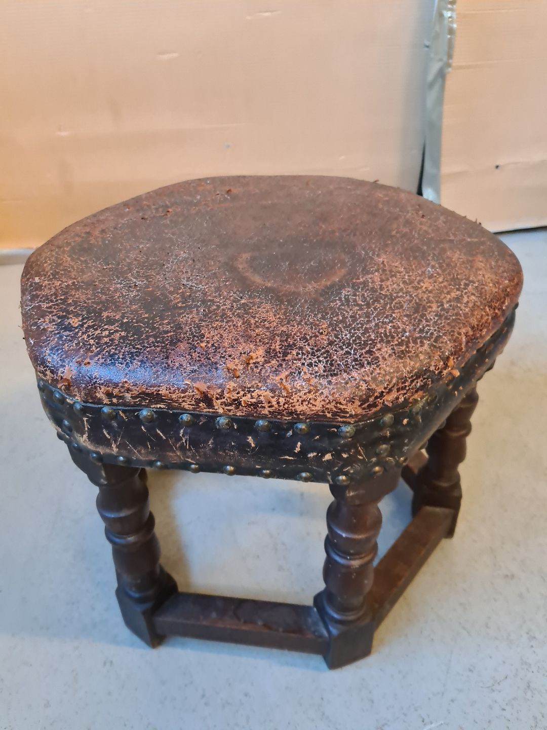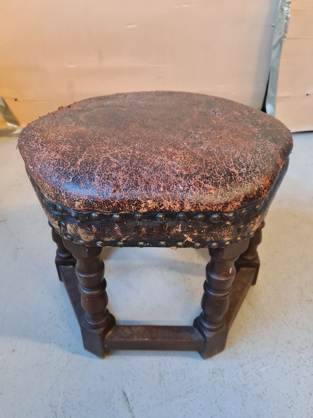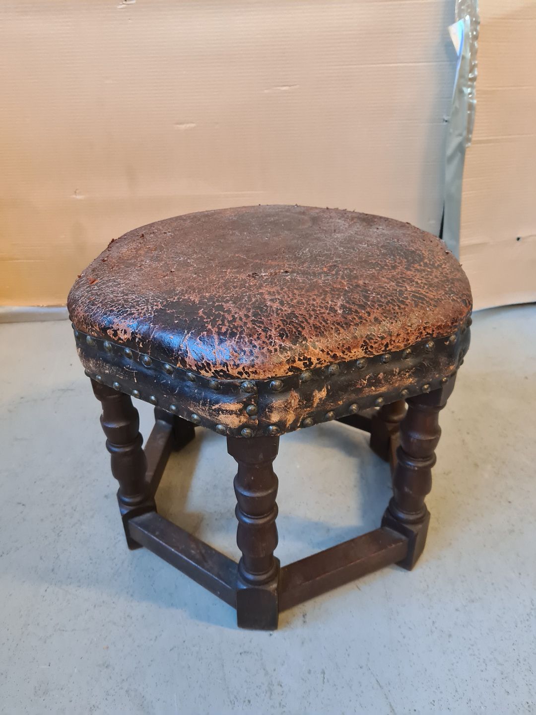Skammel i egetræ med læder betræk, fra 1940erne. Betrækket er slidt. Højde 34cm Diameter 44cm Emne nummer: 73733