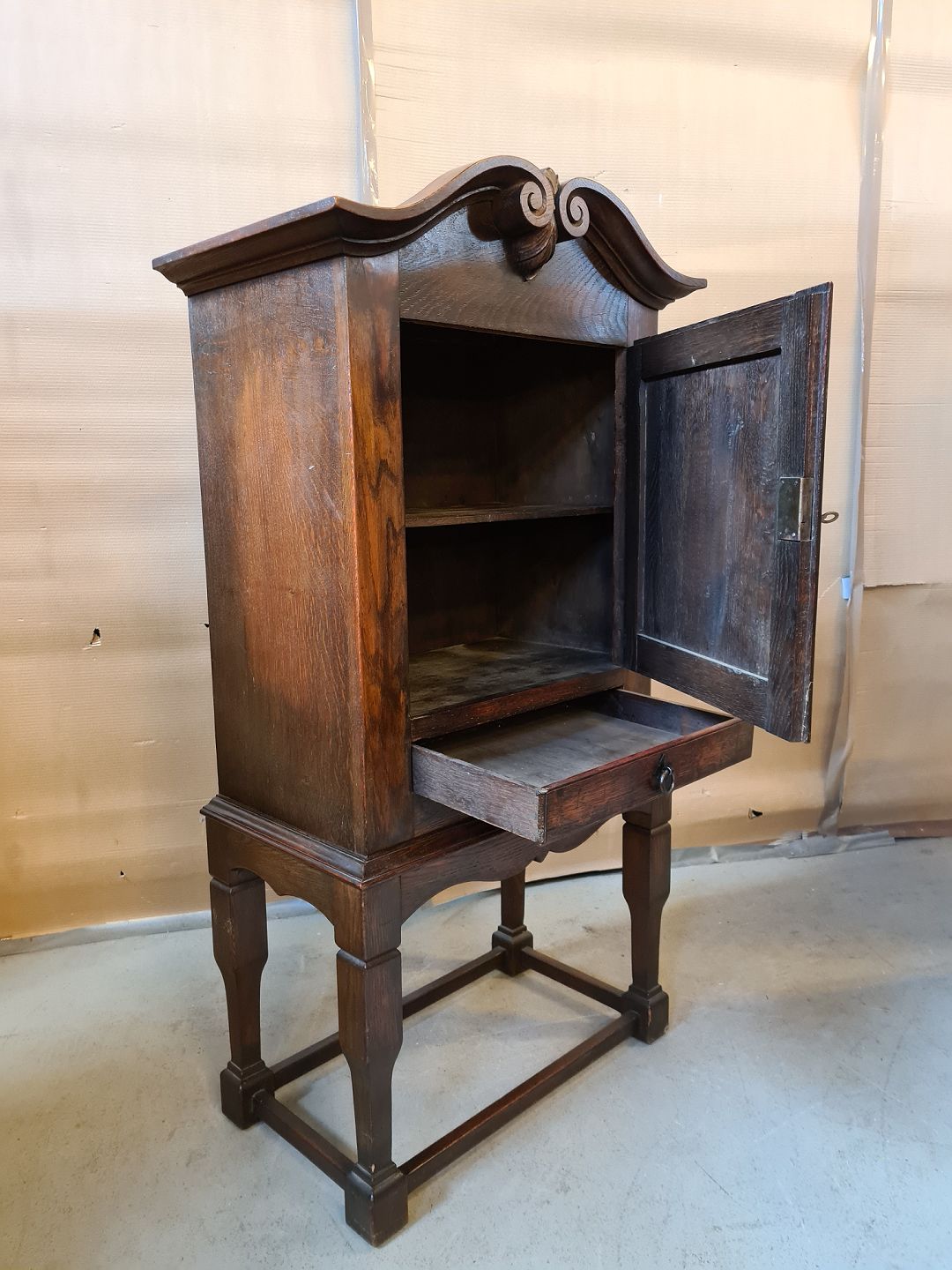 Skab i bejdset egetræ, fra 1980erne. Det har små brugsspor. Højde 130cm Bredde 69cm Dybde 39cm Emne nummer: 73855