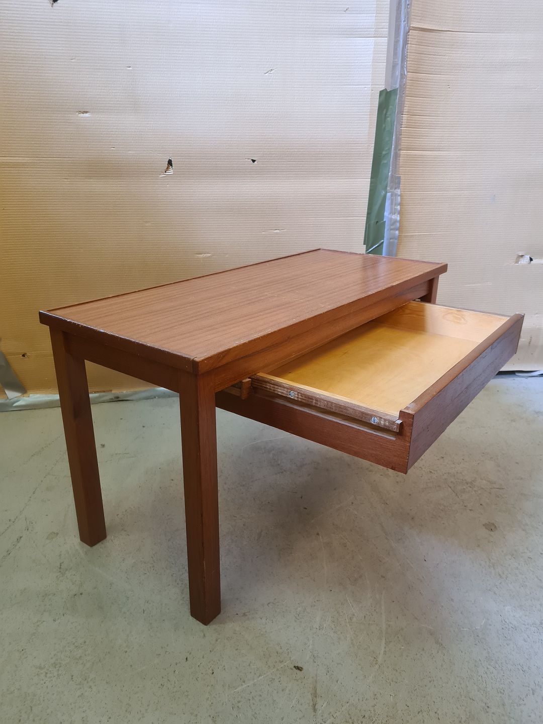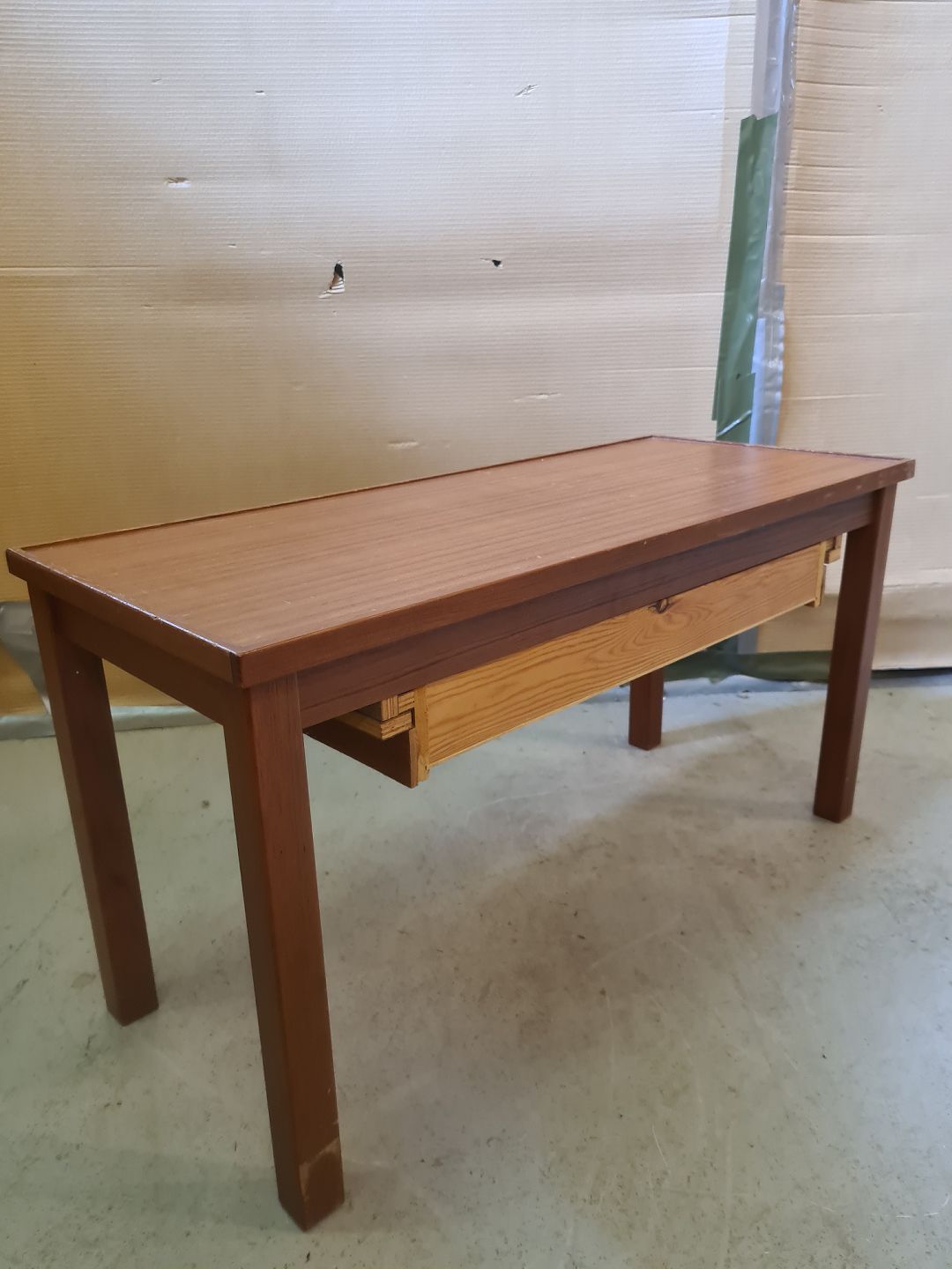 Lampebord i fineret teaktræ med skuffe, fra 1970erne. Det har brugsspor. Højde 42cm Bredde 80cm Dybde 33cm Emne nummer: 74082