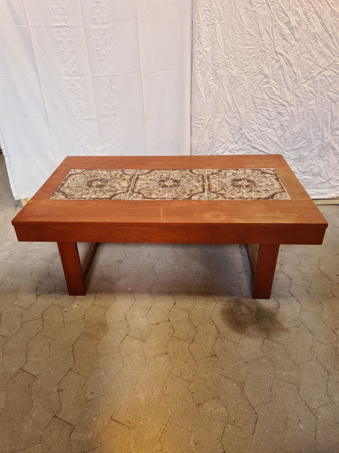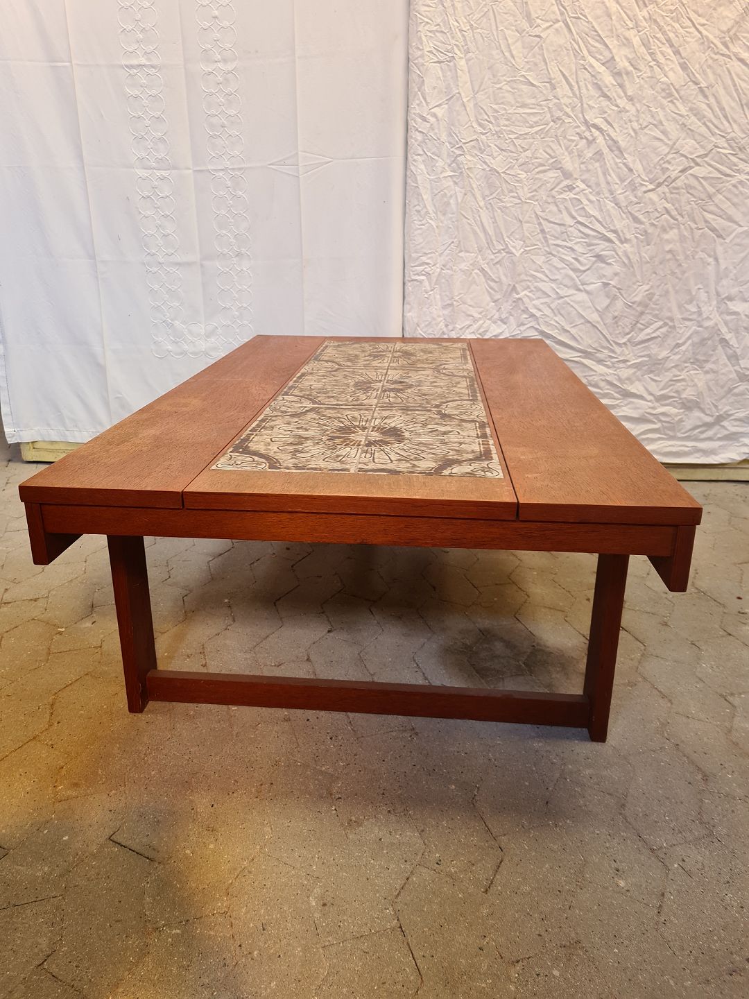 Sofabord i fineret og bejdset egetræ med kakler, fra 1970erne.