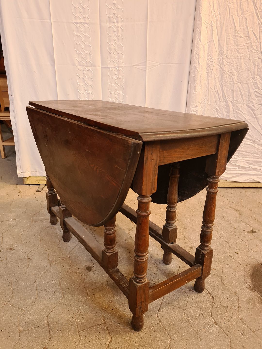 Bord i massivt egetræ, fra 1900erne. Det har brugsspor. Højde 73cm Bredde 106cm Længde 45cm Længde med klapper 136cm Emne nummer: 90600