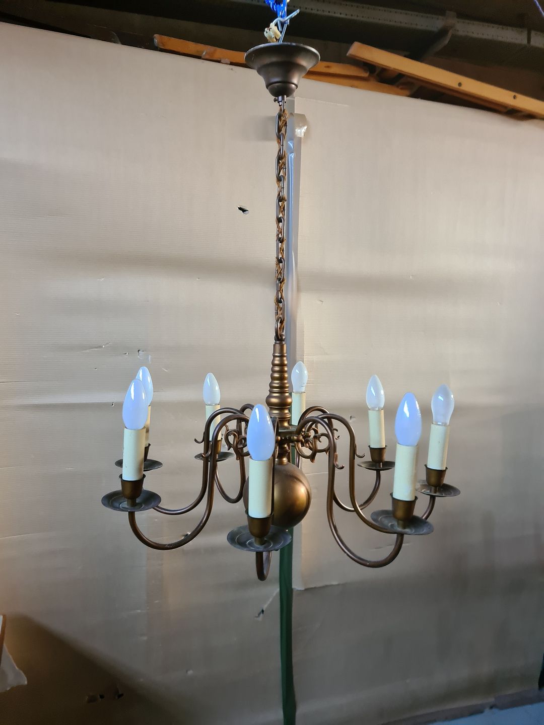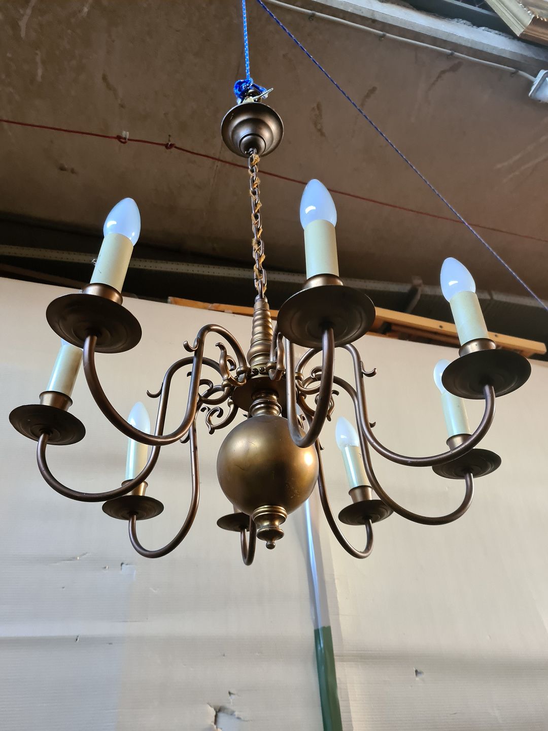 8-armet kirkekrone i bruneret messing, fra 1930erne. Den har brugsspor og ledningen i kæden skal skiftes. Højde med kæde 80cm Diameter 64cm Emne nummer: 74263