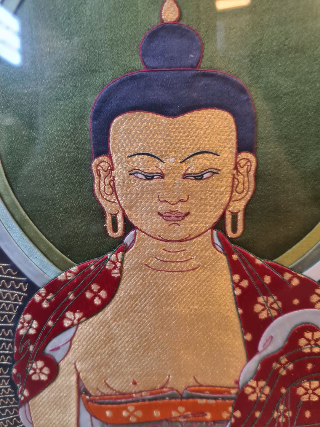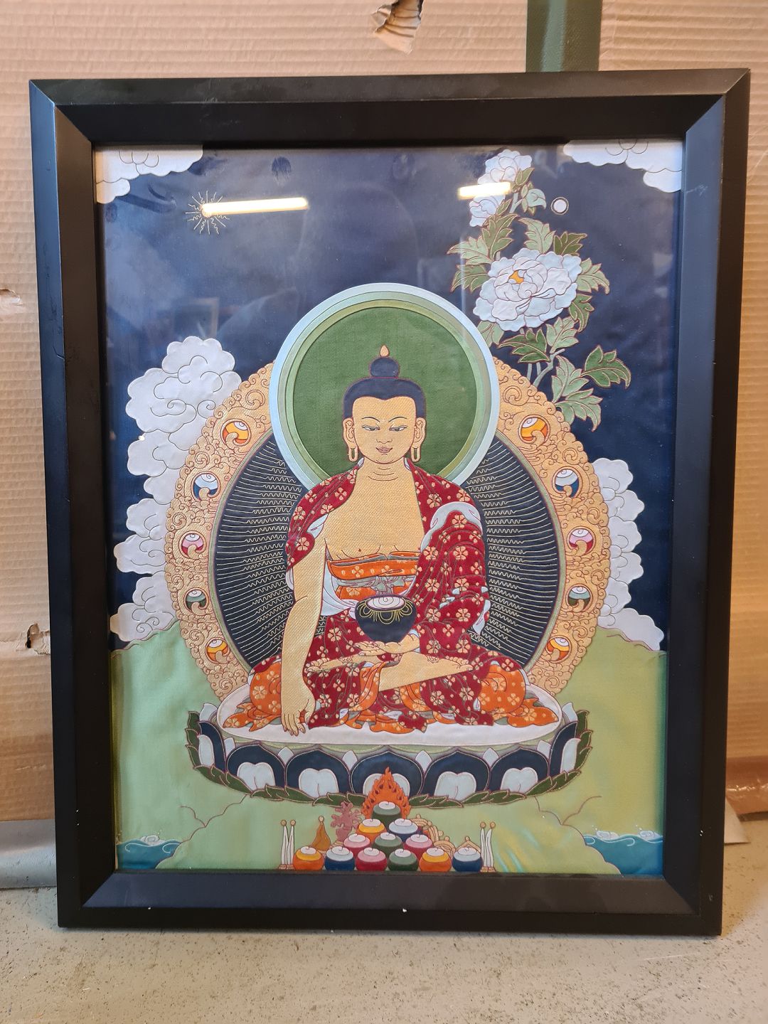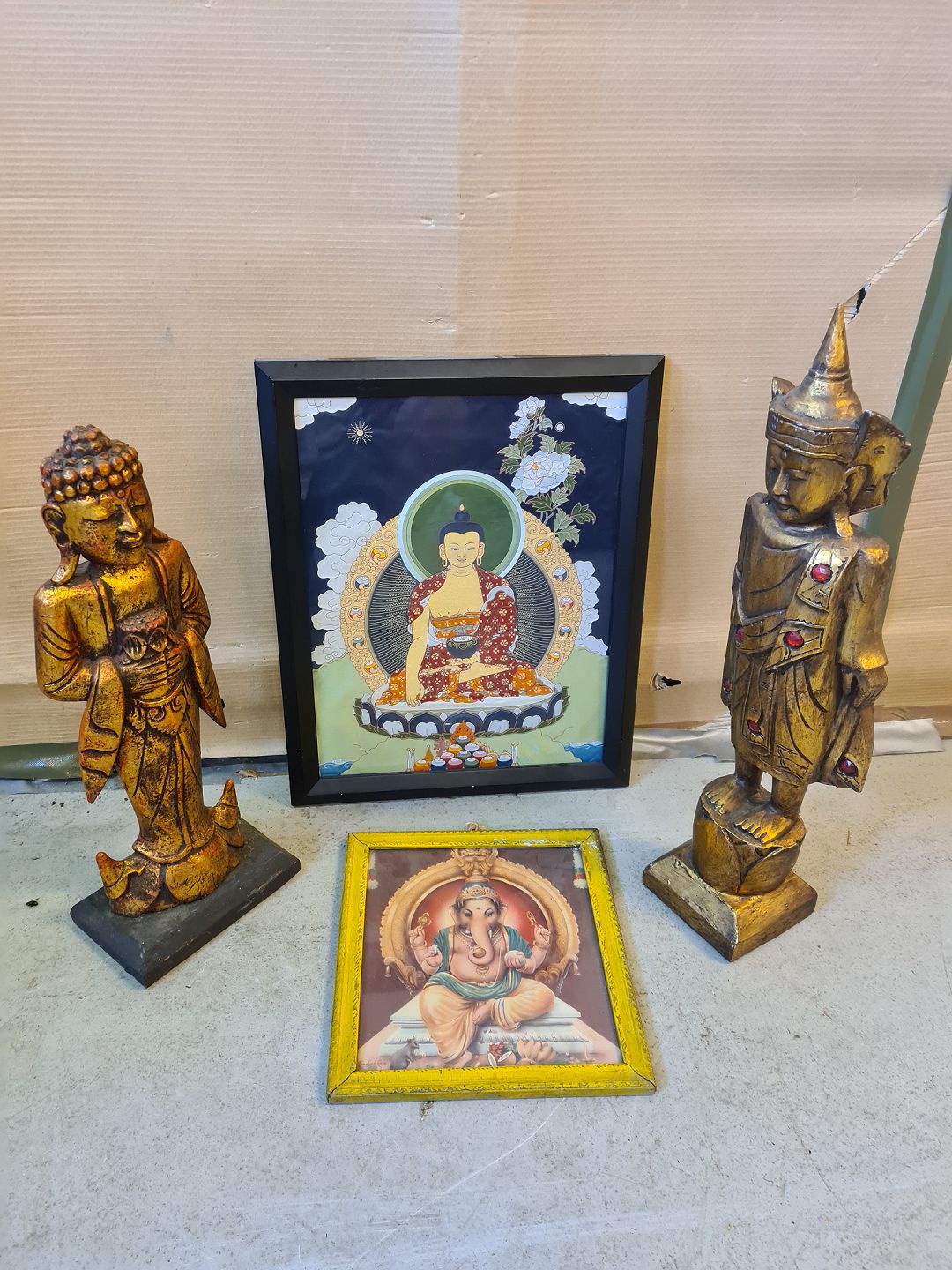 2 Guldmalet Budda figurer og 2 Billeder, fra 12980-1990erne. Figur højde 63cm Bileder : Højde 52cm Bredde 42cm og Højde 32cm Bredde 29cm Emne nummer: 74321