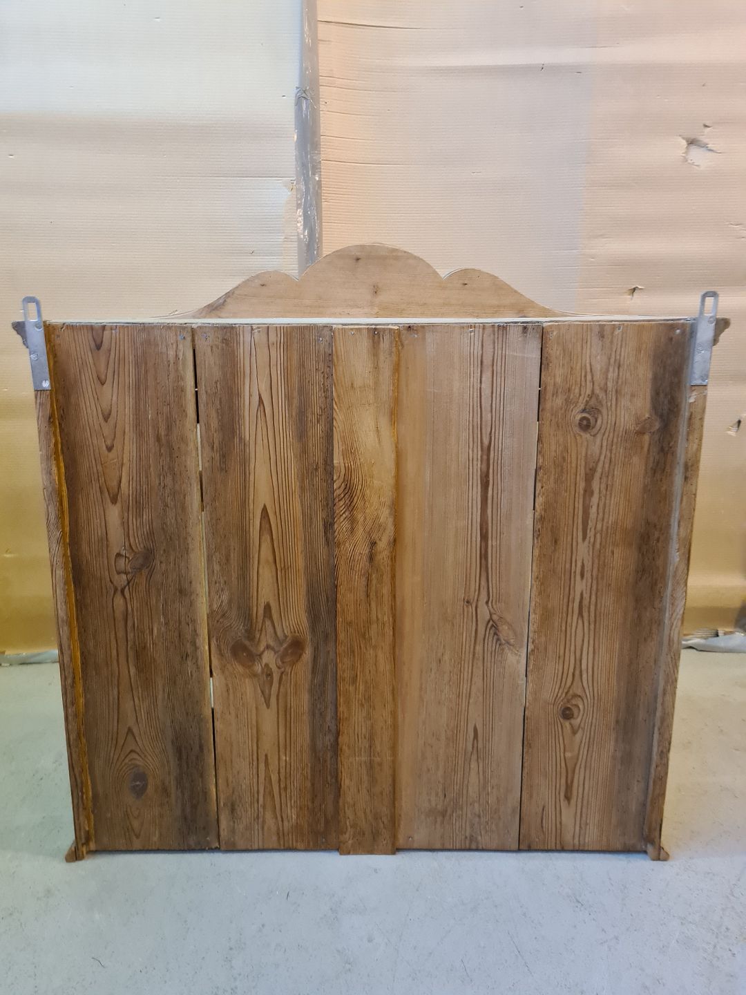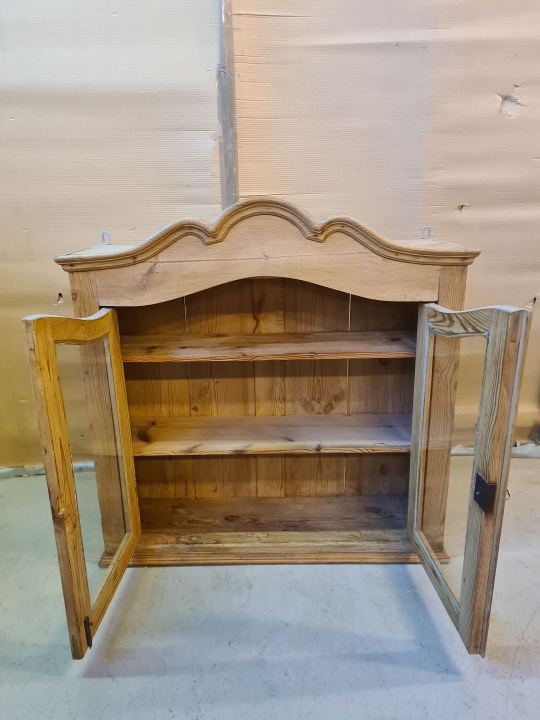 Vitrineskab i massivt fyrretræ, fra 1920erne. Det har patina. Højde 94cm Bredde 94cm Dybde 31cm Emne nummer: 74378