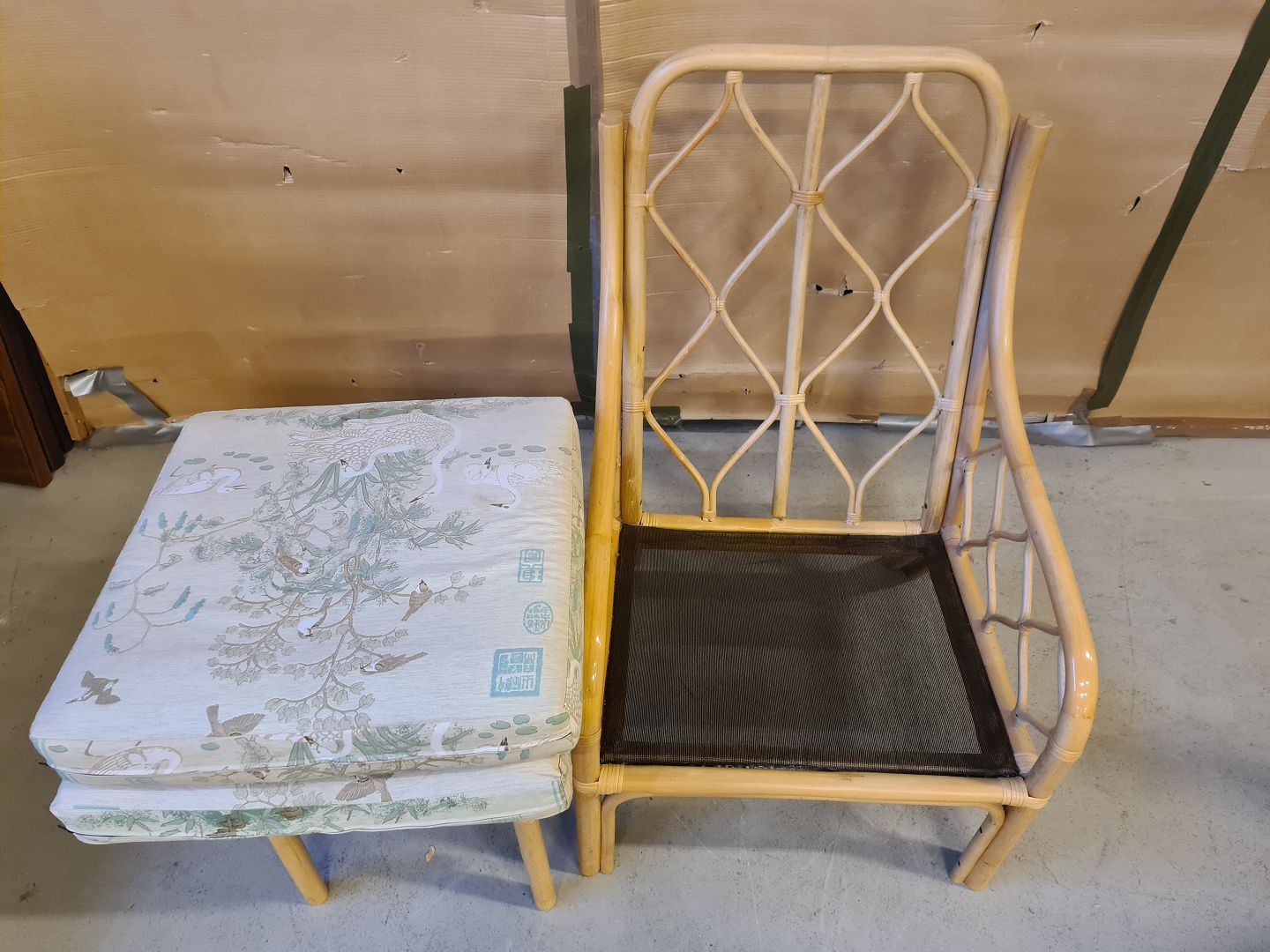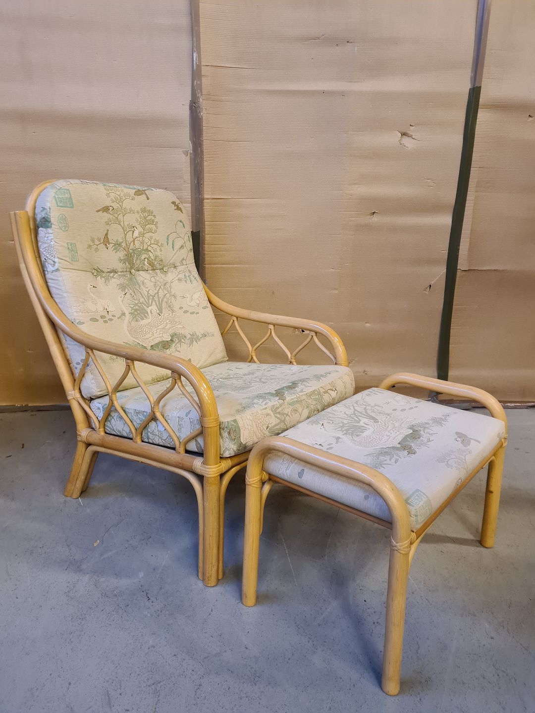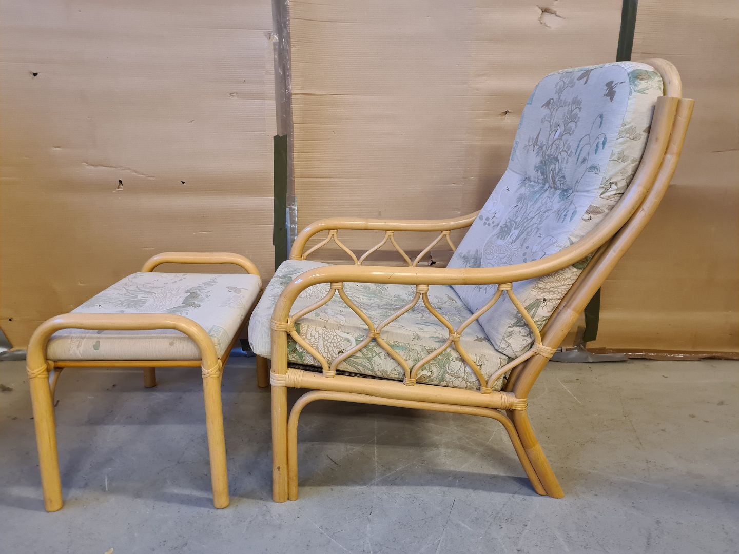 Bambus lænestol med fodskammel, fra 1990erne. Betrækket er slidt. Ryghøjde 97cm Sædehøjde 43cm Emne nummer: 74556