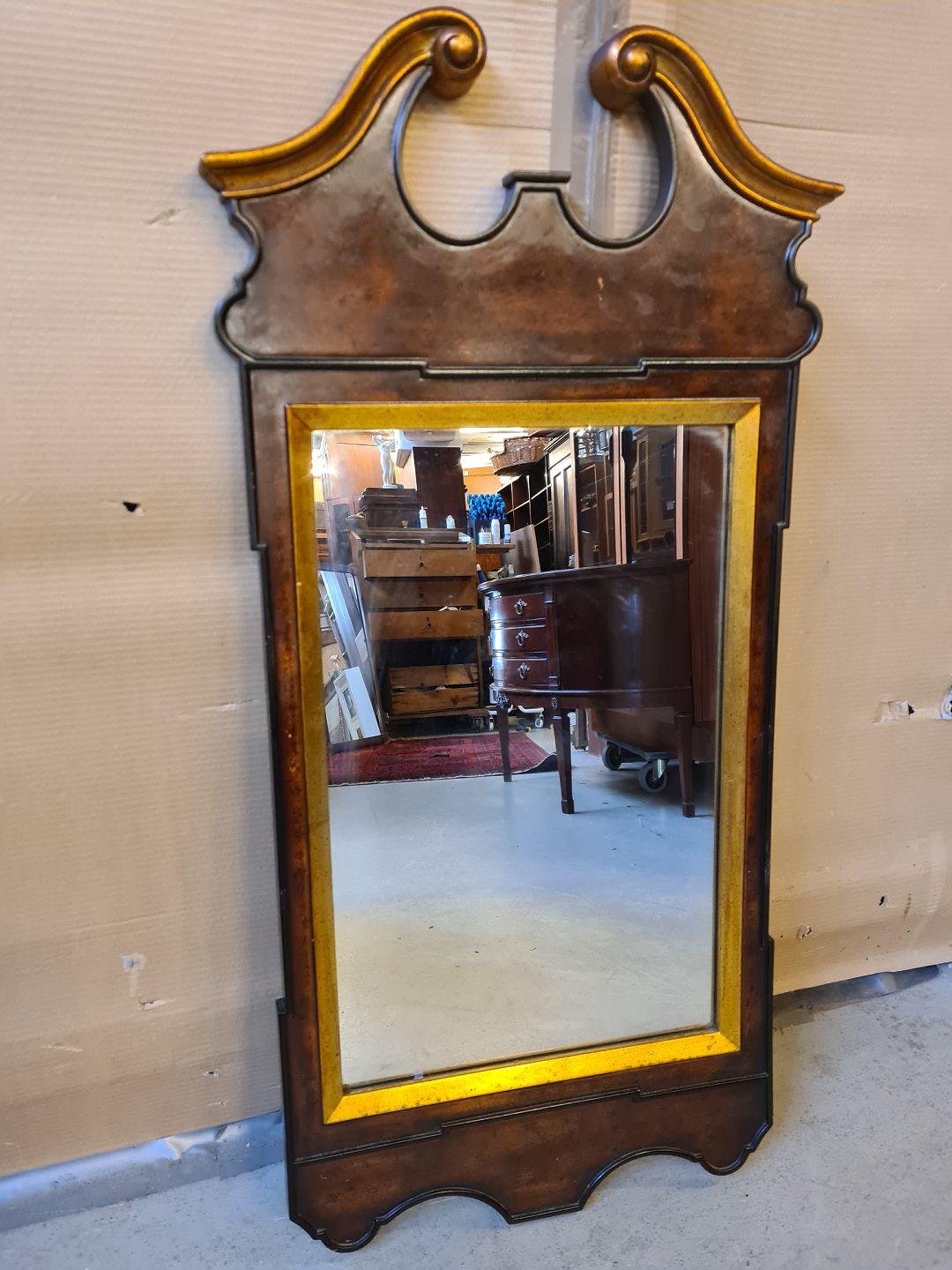 Spejl i fineret nødetræ med guldbelægning, fra 1920-1930erne.