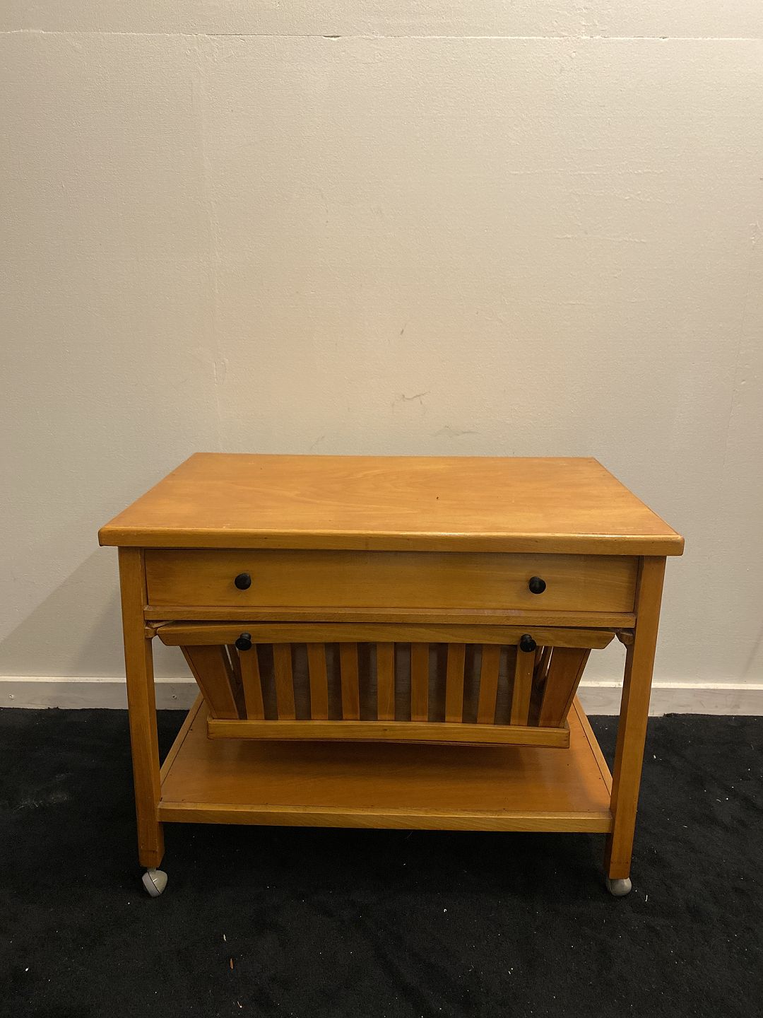 Sybord i eg på hjul og med skuffe og kurv. Fremstår pænt, velholdt og udmærket funktionelt uden nævneværdige brugsspor. HxBxD 53x67x43 cm. Emne nummer: 80368