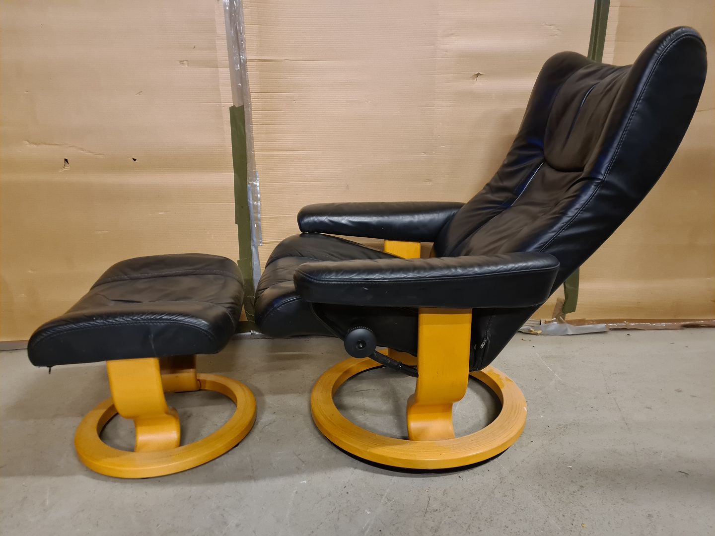 Stressless læder lænestol med fodskammel, fra 2000erne. Den har brugsspor. Ryghøjde 96cm Sædehøjde 38cm Emne nummer: 74756