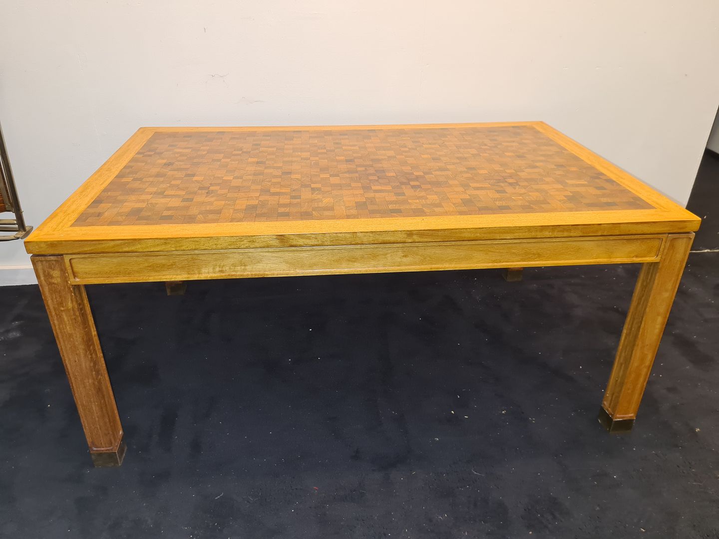 Sofabord i teak og mahogni og med messingsko. Udført hos Tranekær møbelfabrik. Fremstår pænt og velholdt uden nævneværdige brugsspor.