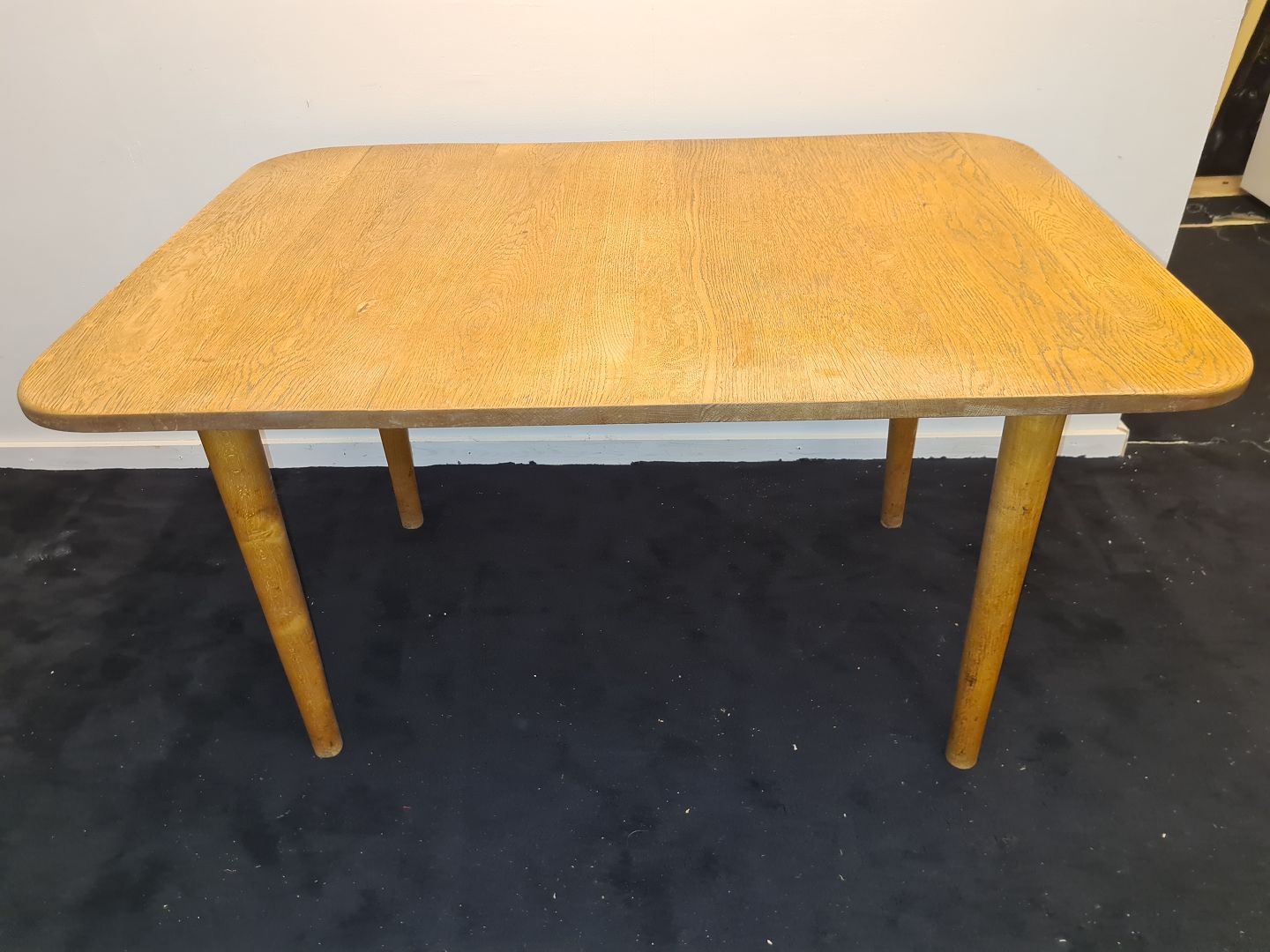 Spisebord med plade i massiv eg. Fremstår pænt dog med brugsspor i form af revne i pladen (billede) og lettere vakkelvorn. HxLxB 68x121x84 cm. Emne nummer: 80393