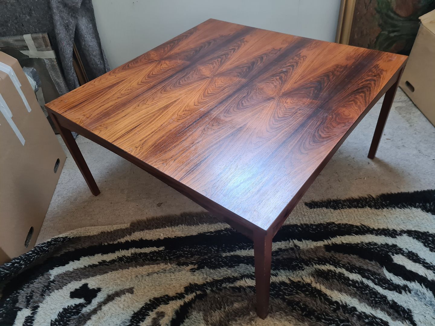 Dansk Design kvadratisk sofabord fra 1970'erne i palisanderfinér. Fremstår pænt og velholdt uden de store brugsspor. Højde 54 cm. Længde 100 cm. Bredde 100 cm. Emne nummer: 80453