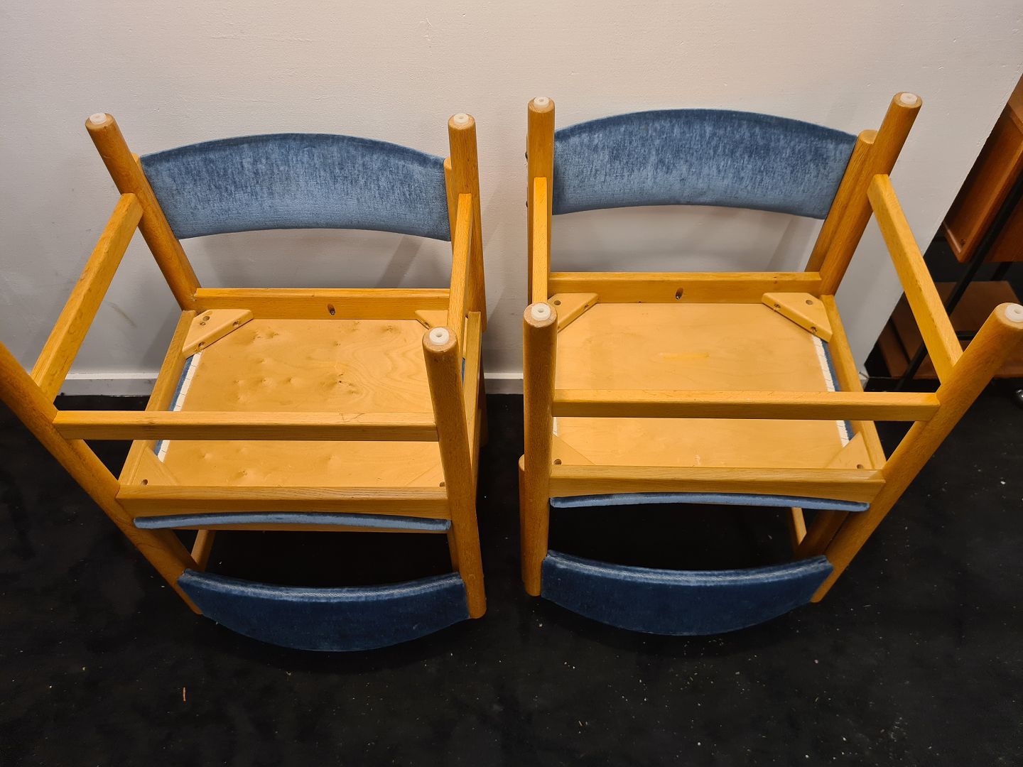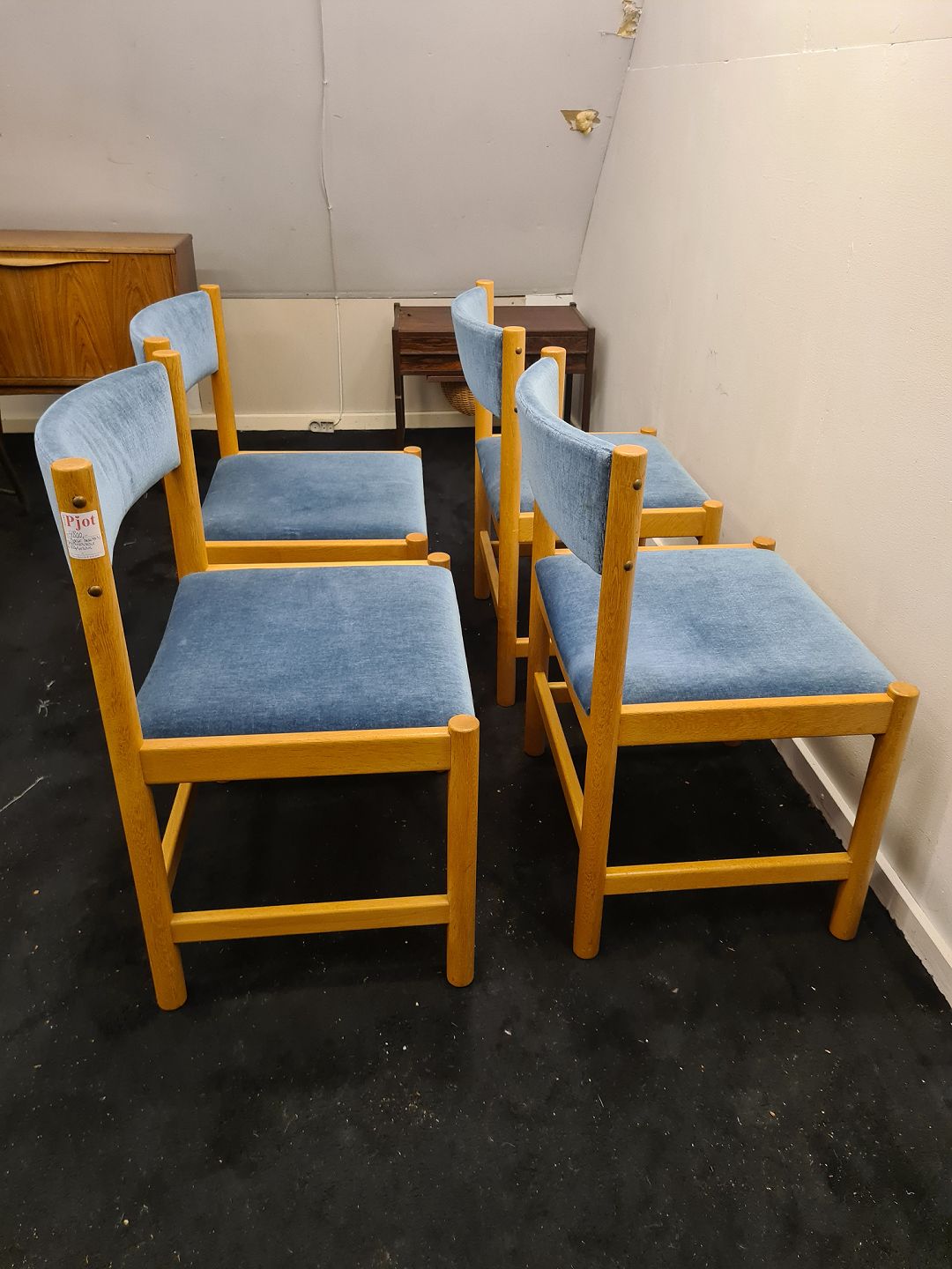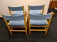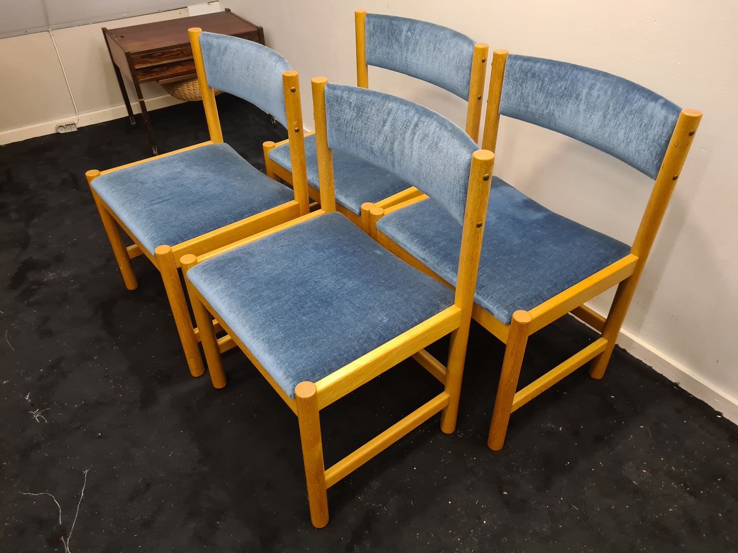 4 Spisebordsstole designet af Børge Mogensen. Her i eg med blå velour på ryg og sæde. Stolene er fra 70´erne og fremstår i pæn brugt stand med kun lettere slid på velouren.