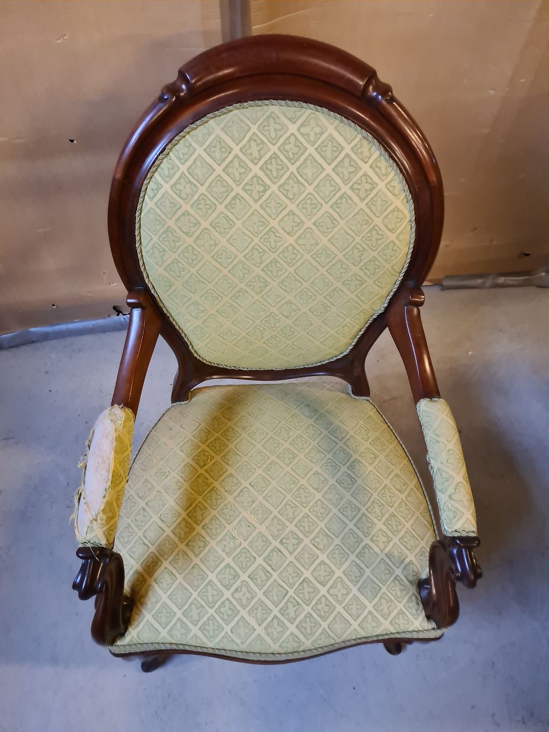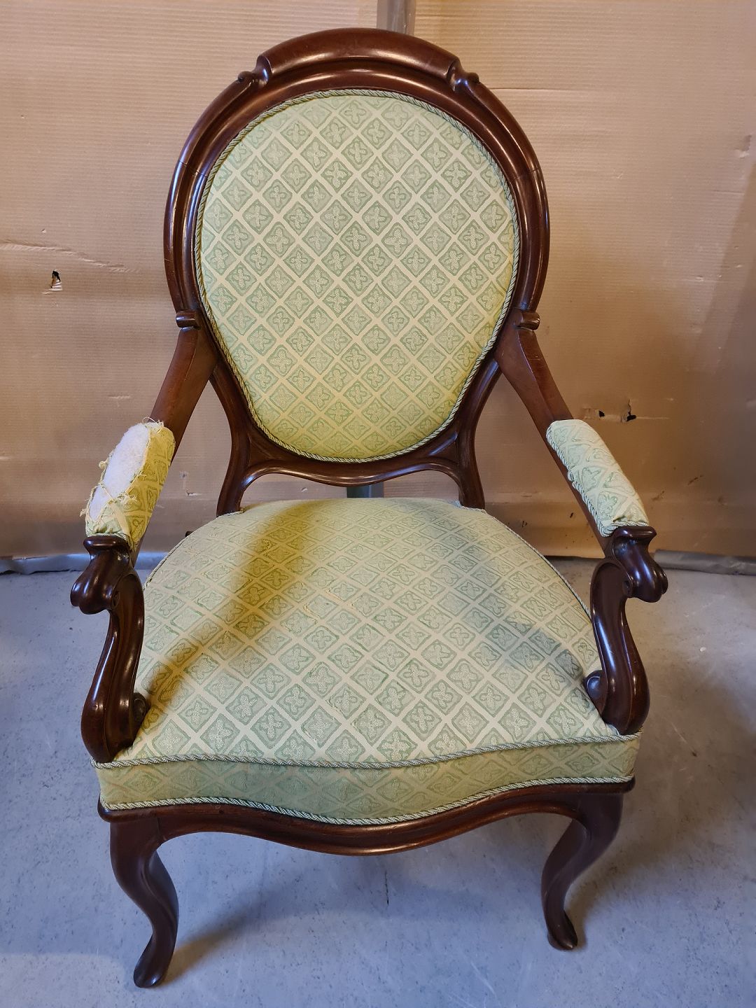 Armstol i mahogni, fra 1910erne. Den har defekt betræk på armlænet. Ryghøjde 102cm Sædehøjde 45cm Emne nummer: 75053