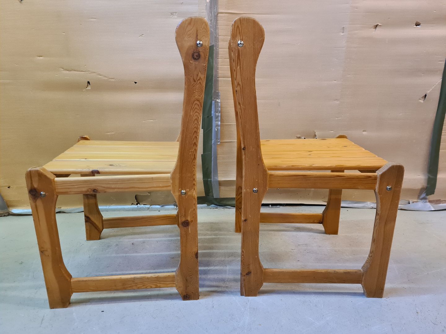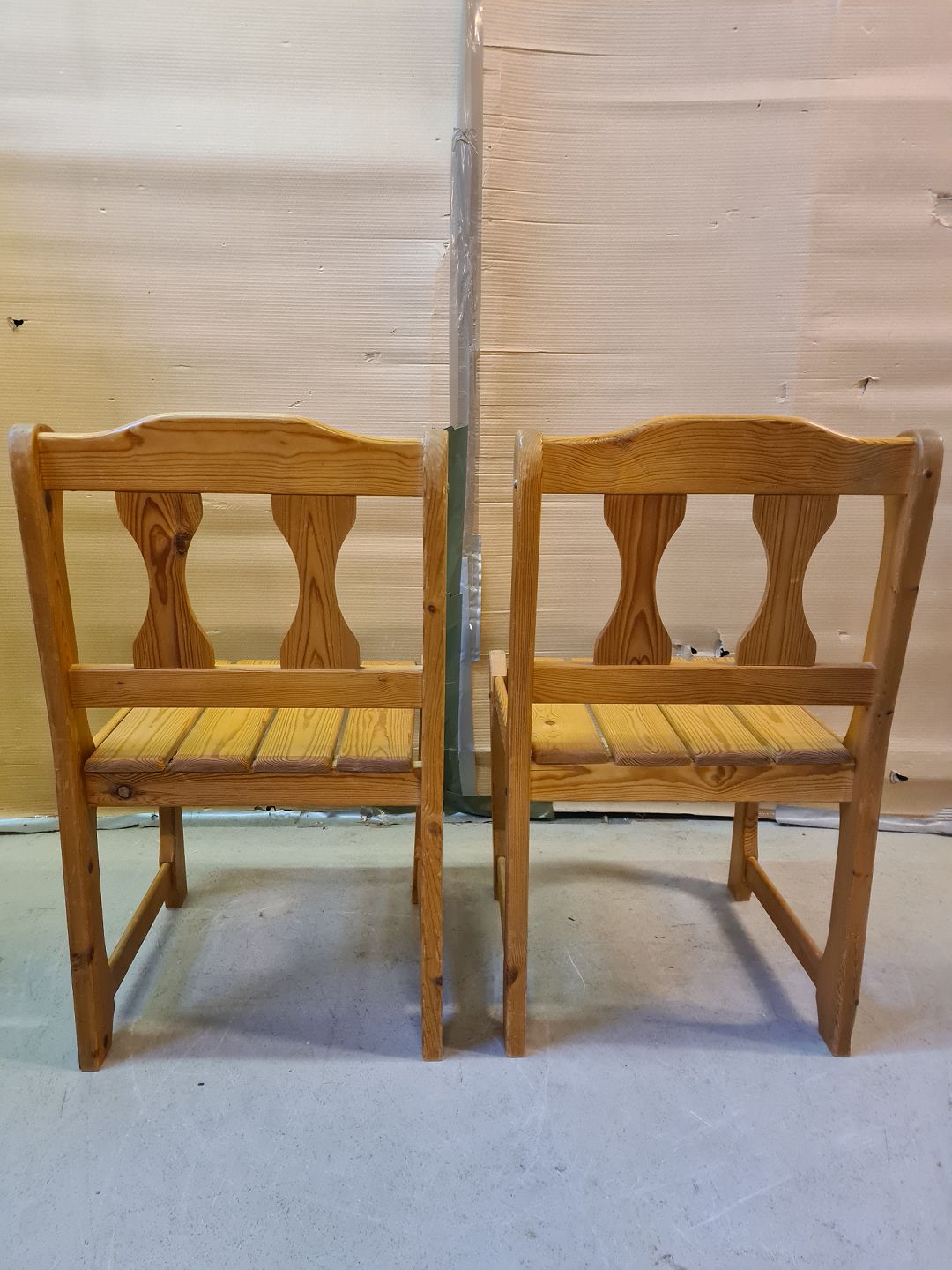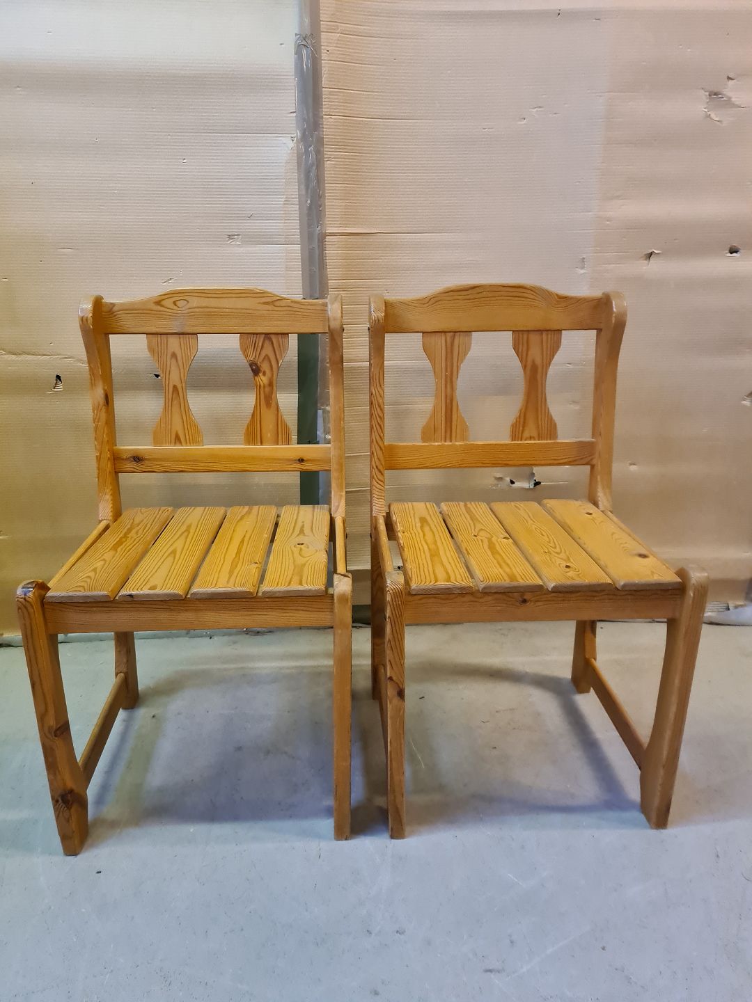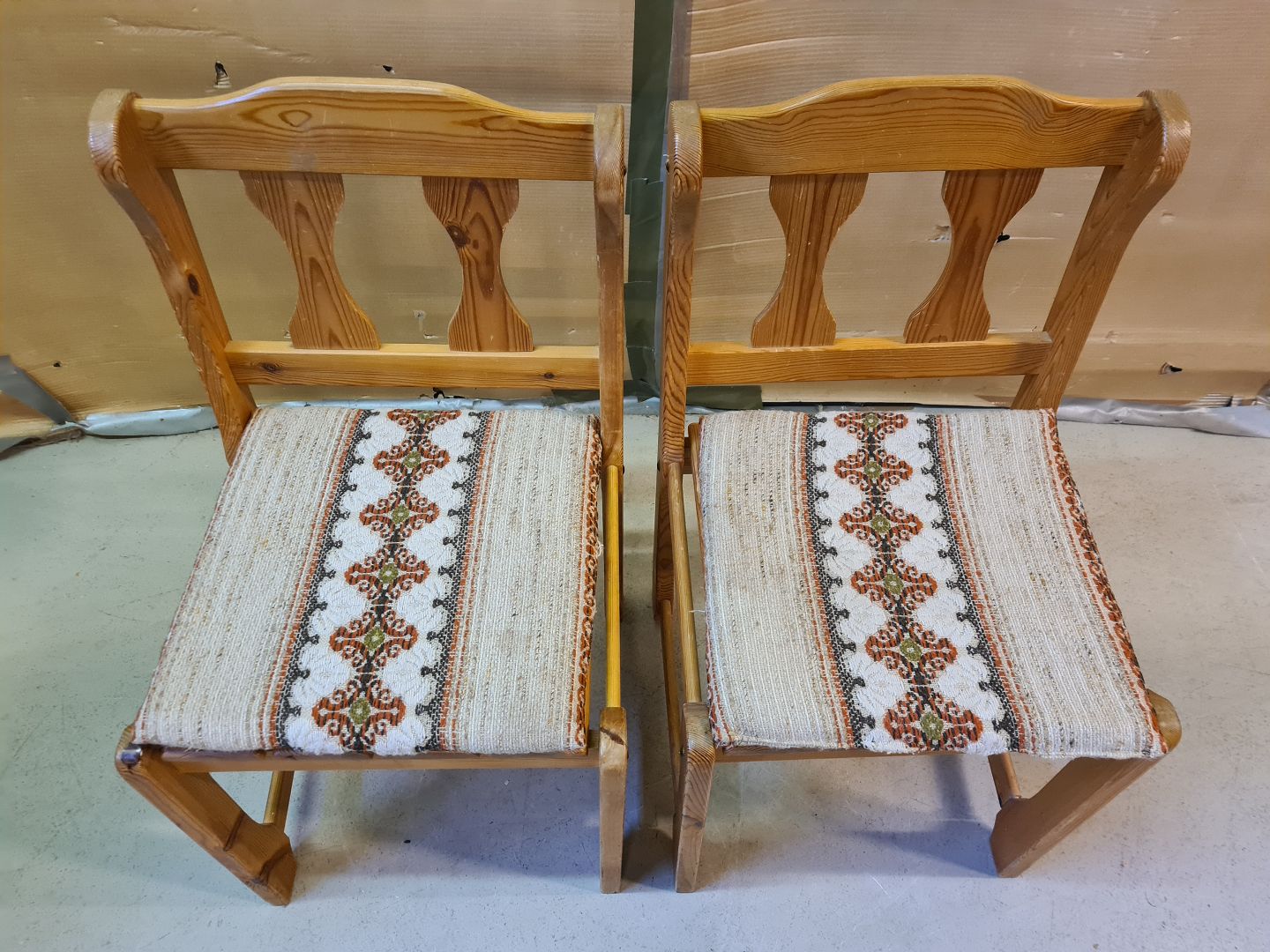 2 Stole i massivt fyrretræ, fra 1980erne. De har brugsspor og pudebetrækket er slidt. Ryghøjde 83cm Sædehøjde 43cm Emne nummer: 75211