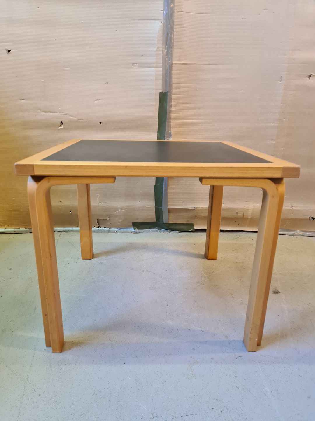 Sofabord i bøgetræ med sort linoleumsplade, fra 1980erne. Det har brugsspor. Højde 57cm Bredde 70cm Længde 70cm Emne nummer: 75255