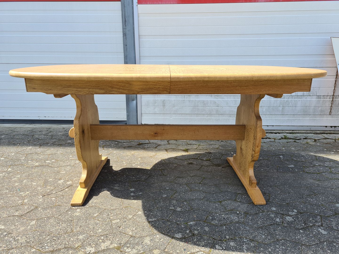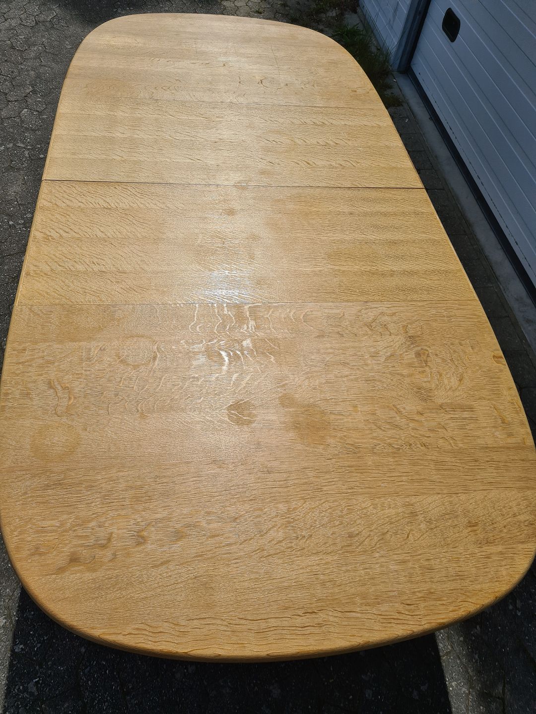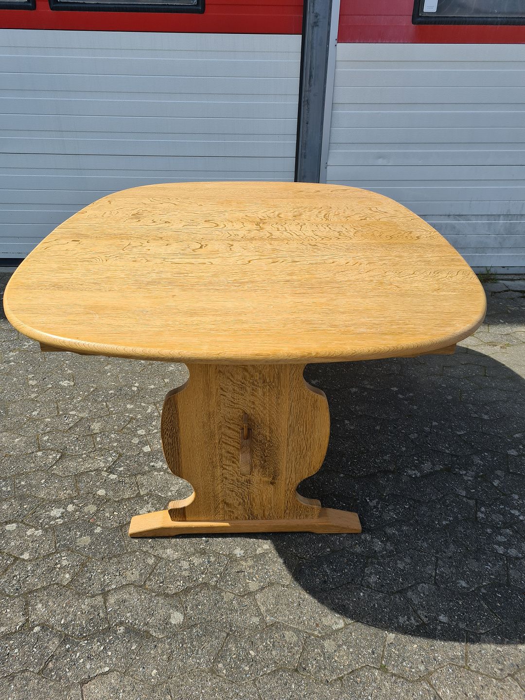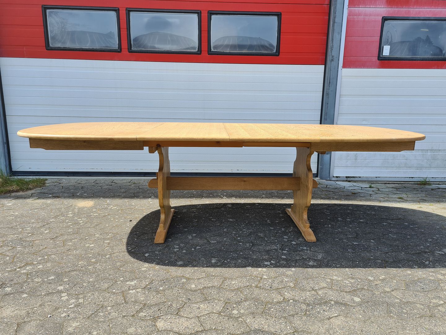 Spisebord i massivt egetræ med 2 tillægsplader, fra 1980erne. Det har små brugsspor. Højde 74cm Bredde 120cm Længde 160cm Længde med 2 tillægsplader 260cm Emne nummer: 75384