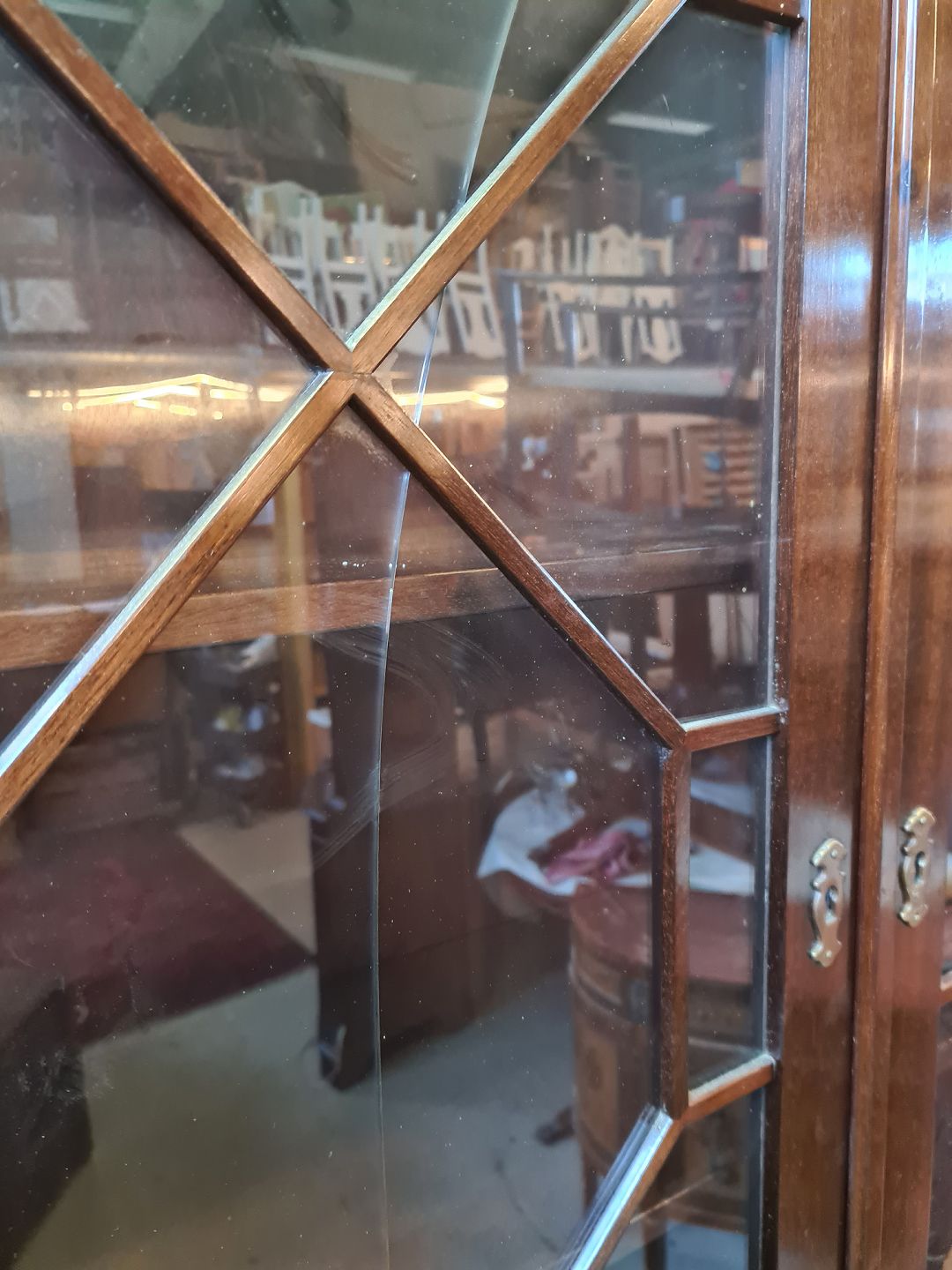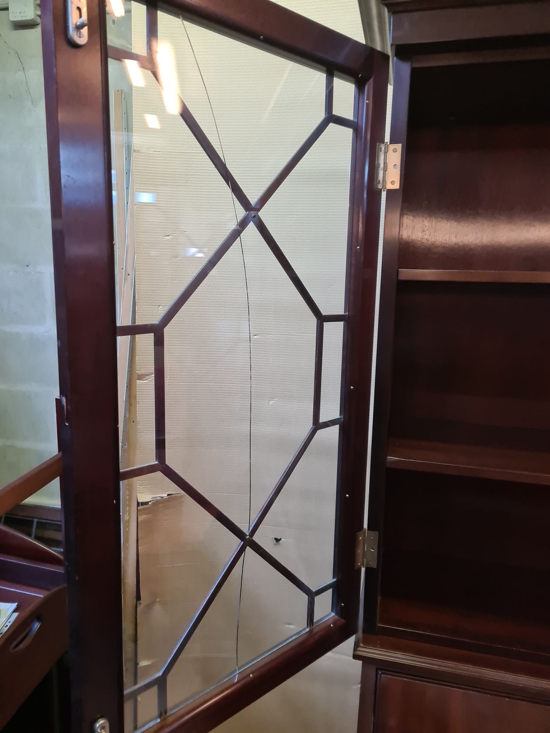 Det har brugsspor og en revne i glasset i venstre låge.